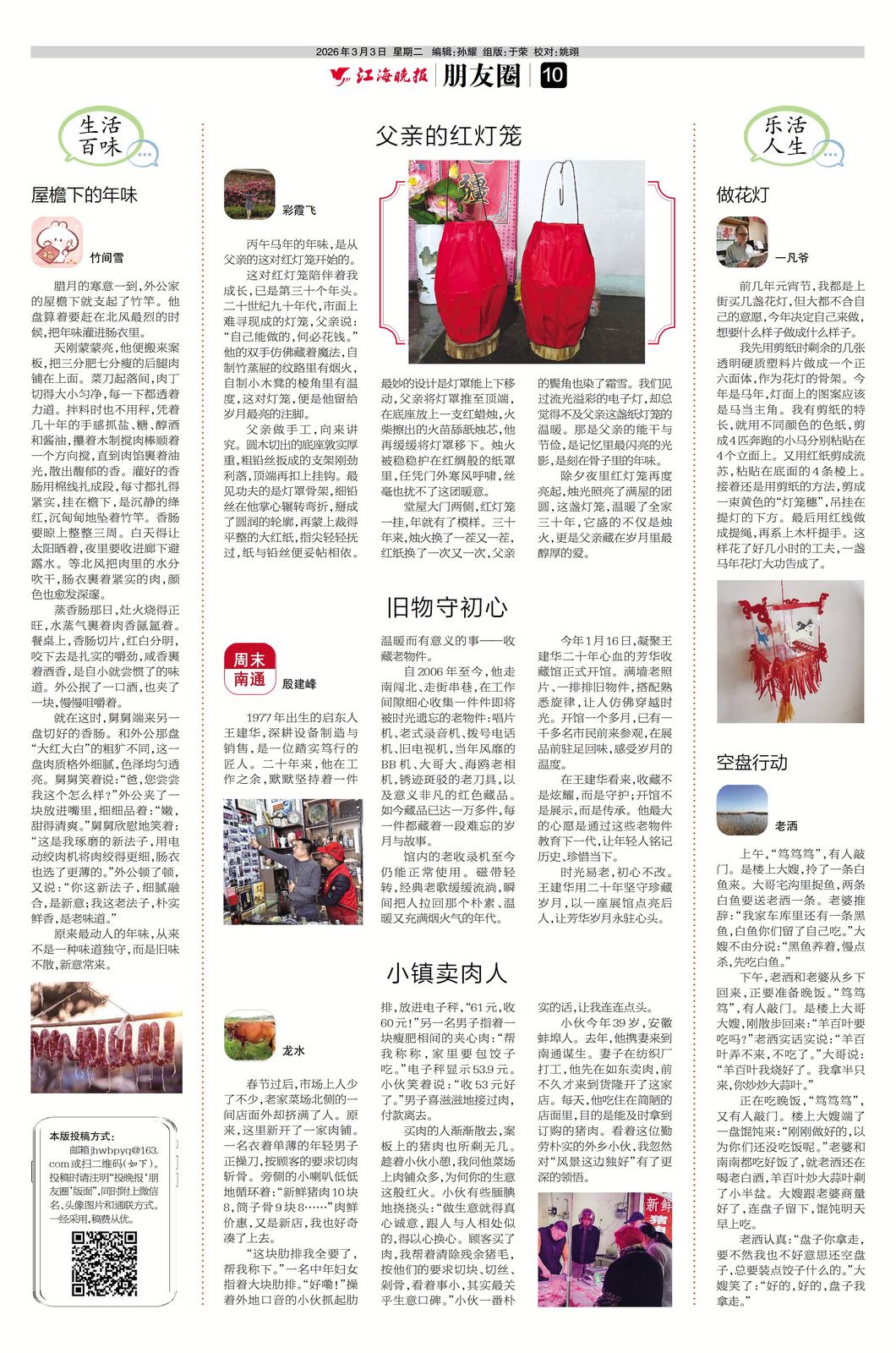 这对红灯笼陪伴着我成长,已是第三十个年头。二十世纪九十年代,市面上难寻现成的灯笼,父亲说:“自己能做的,何必花钱。”他的双手仿佛藏着魔法,自制竹蒸屉的纹路里有烟火,自制小木凳的棱角里有温度,这对灯笼,便是他留给岁月最亮的注脚。