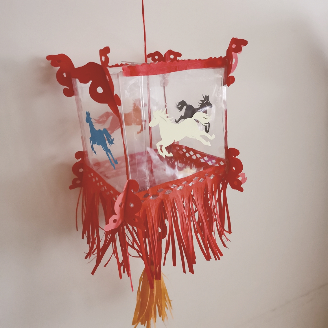 我先用剪纸时剩余的几张透明硬质塑料片做成一个正六面体,作为花灯的骨架。今年是马年,灯面上的图案应该是马当主角。我有剪纸的特长,就用不同颜色的色纸,剪成4匹奔跑的小马分别粘贴在4个立面上。又用红纸剪成流苏,粘贴在底面的4条棱上。接着还是用剪纸的方法,剪成一束黄色的“灯笼穗”,吊挂在提灯的下方。最后用红线做成提绳,再系上木杆提手。这样花了好几小时的工夫,一盏马年花灯大功告成了。