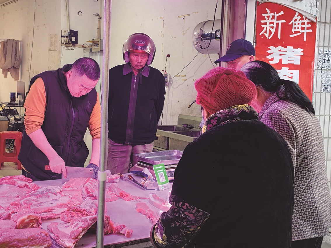 春节过后,市场上人少了不少,老家菜场北侧的一间店面外却挤满了人。原来,这里新开了一家肉铺。一名衣着单薄的年轻男子正操刀,按顾客的要求切肉斩骨。旁侧的小喇叭低低地循环着:“新鲜猪肉10块8,筒子骨9块8……”肉鲜价惠,又是新店,我也好奇凑了上去。