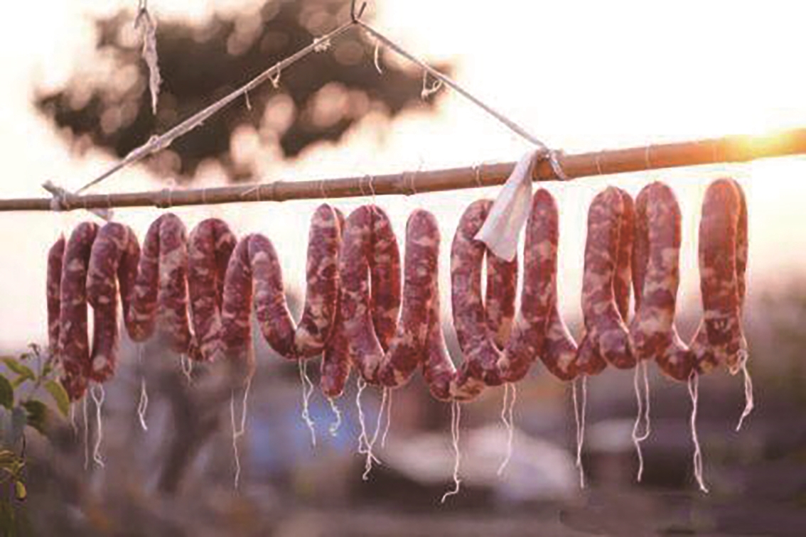 天刚蒙蒙亮,他便搬来案板,把三分肥七分瘦的后腿肉铺在上面。菜刀起落间,肉丁切得大小匀净,每一下都透着力道。拌料时也不用秤,凭着几十年的手感抓盐、糖、醇酒和酱油,攥着木制搅肉棒顺着一个方向搅,直到肉馅裹着油光,散出馥郁的香。灌好的香肠用棉线扎成段,每寸都扎得紧实,挂在檐下,是沉静的绛红,沉甸甸地坠着竹竿。香肠要晾上整整三周。白天得让太阳晒着,夜里要收进廊下避露水。等北风把肉里的水分吹干,肠衣裹着紧实的肉,颜色也愈发深邃。