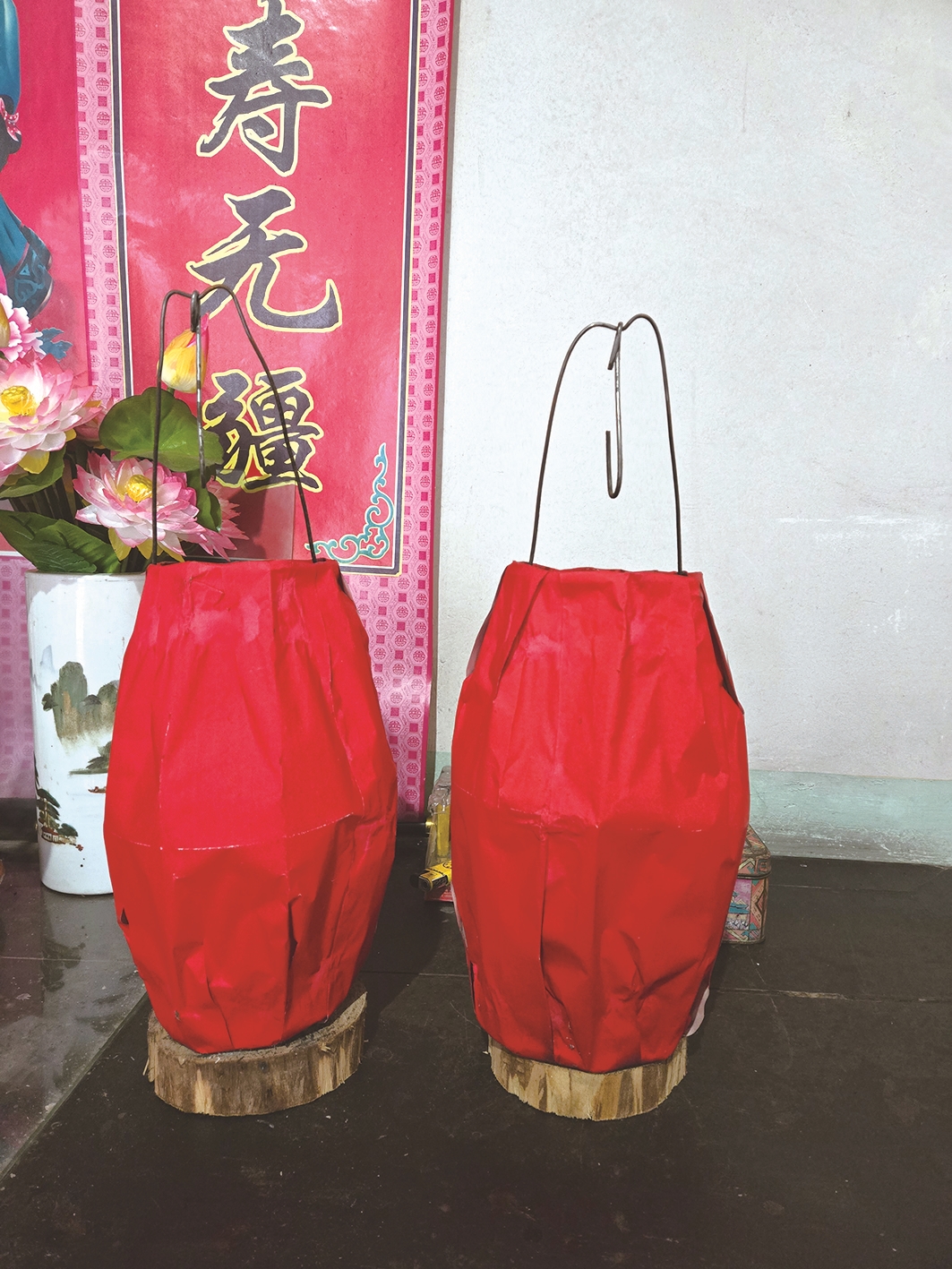 父亲做手工,向来讲究。圆木切出的底座敦实厚重,粗铅丝扳成的支架刚劲利落,顶端再扣上挂钩。最见功夫的是灯罩骨架,细铅丝在他掌心辗转弯折,掰成了圆润的轮廓,再蒙上裁得平整的大红纸,指尖轻轻抚过,纸与铅丝便妥帖相依。最妙的设计是灯罩能上下移动,父亲将灯罩推至顶端,在底座放上一支红蜡烛,火柴擦出的火苗舔舐烛芯,他再缓缓将灯罩移下。烛火被稳稳护在红绸般的纸罩里,任凭门外寒风呼啸,丝毫也扰不了这团暖意。