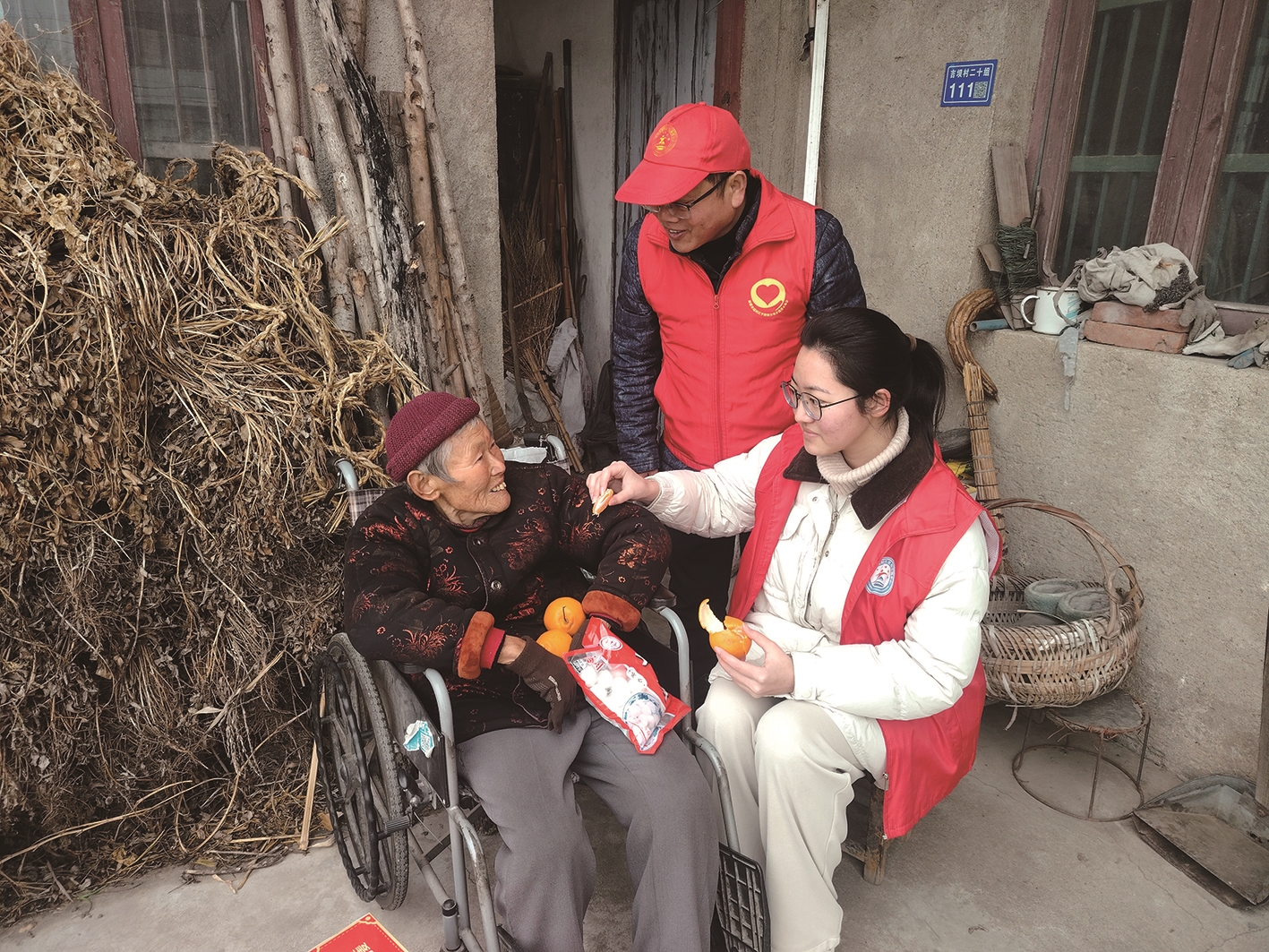 殷建峰叔叔快步上前,一边安置物资,一边笑着对奶奶说:“今天元宵节,带孩子来陪您过节,以后有啥需要,我们随叫随到!”八年的坚守,从偶然帮扶到常态化陪伴,他的话格外有分量。我蹲在奶奶身旁,一边剥橘子一边陪她聊天,小院里渐渐热闹起来。