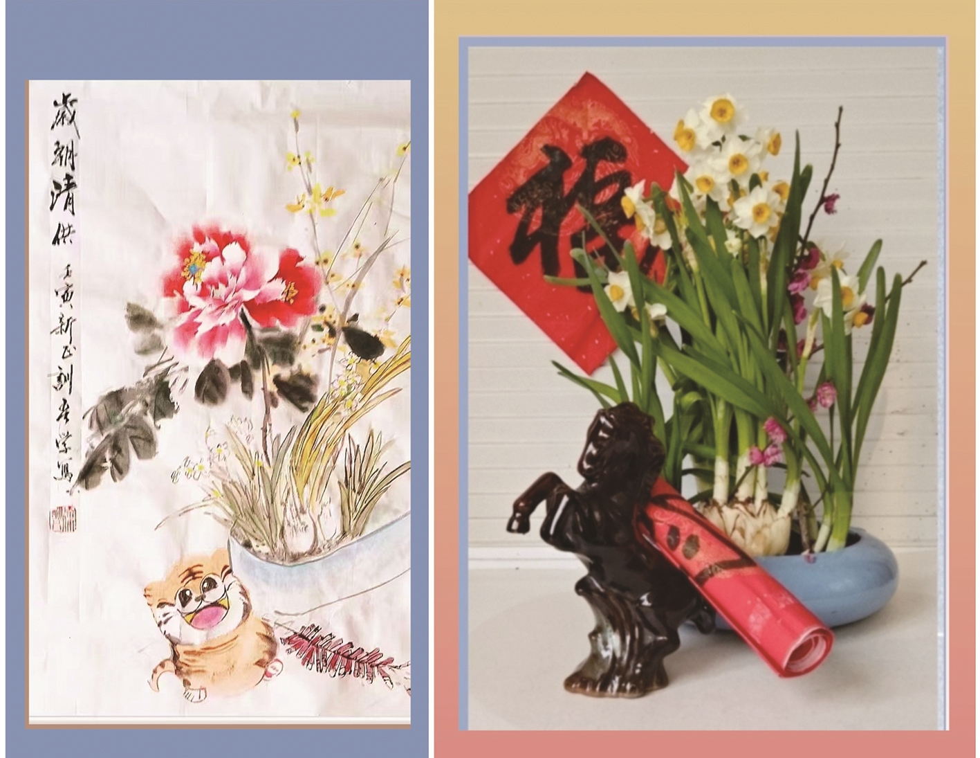 试将两图相拼,虽新旧作品色彩有别,然画面即刻灵动有趣。水仙下方幼虎呆萌露笑脸,黑马作揖似拜年。当年处于疫情,希望能虎虎生威身体好,现在迎来吉祥,盼的是“马上有福”寿绵长。