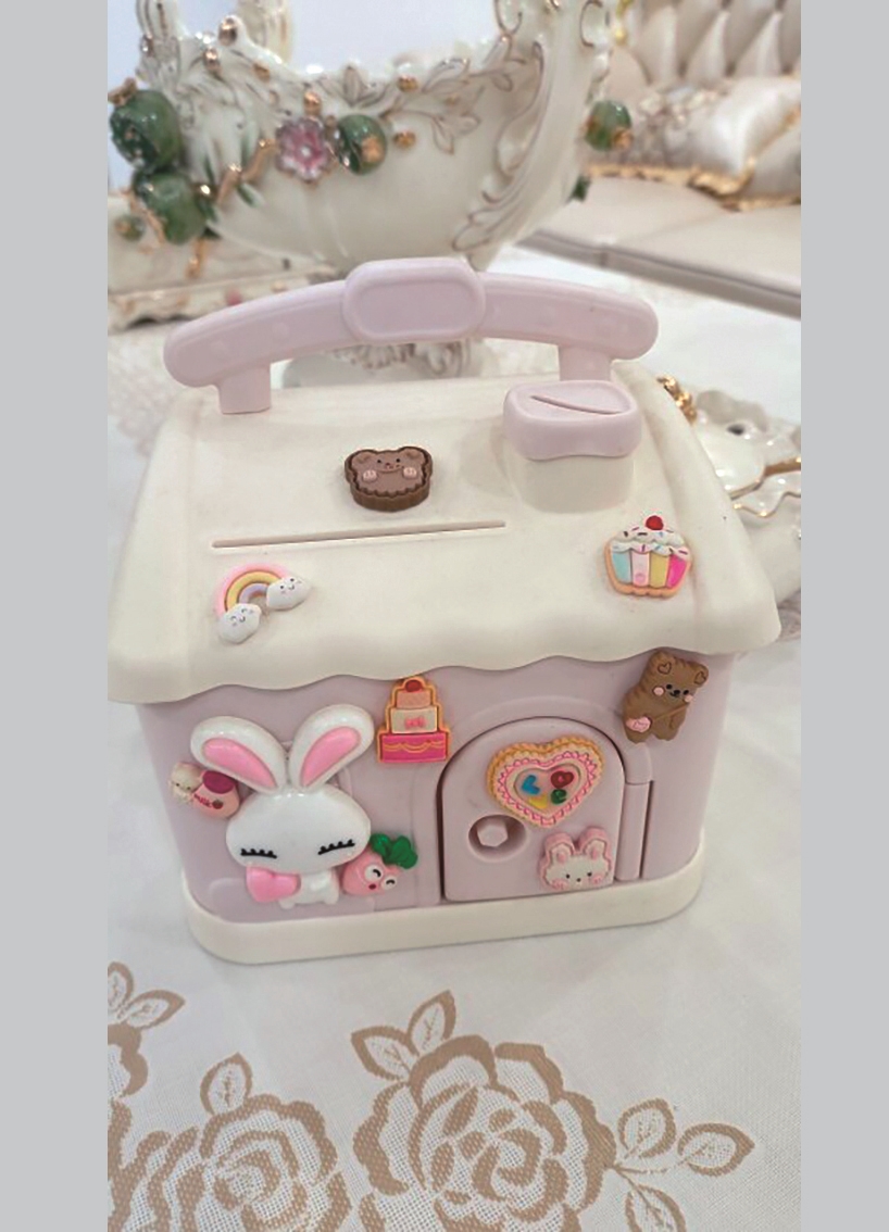 家里的方桌上多了一座“童话小镇”。那是妻子心爱的储钱罐——粉白相间的小屋,屋顶的投币口像等待惊喜的天窗。憨态可掬的饼干熊倚在墙边,一只兔子从窗户探出头,仿佛在守护这方小天地。