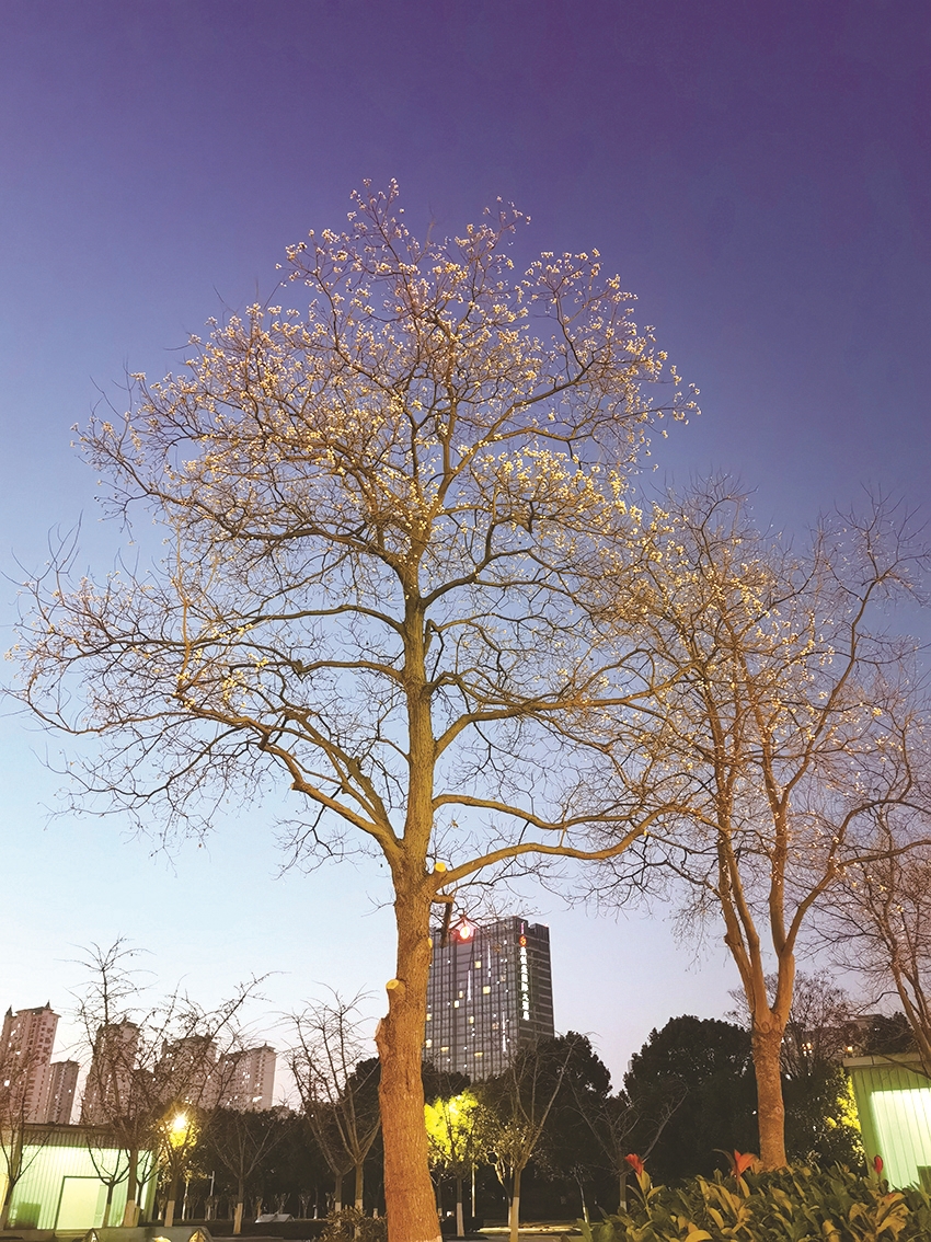 偶然的机会,在朋友的茶室看到一个花瓶里插着一根分叉的树枝,枝头还结着三裂的白色蒴果,果实繁密。朋友告诉我,这是乌桕树的树枝,他折来插入花瓶,居然也开花结果了。前天,我去单位上班时,在车库旁看到了好几棵乌桕树,清瘦的枝桠在天空下尽情舒展,纵横交错、不枝不蔓,每一道转折都蕴藏着柔韧的力量,缀满枝头的桕果,莹白如玉,浅白似雪,一簇簇挂在枝头,如梅花一般,素雅出尘。难怪元代诗人黄镇成见此情景欣然赋诗“前村乌桕熟,疑是早梅花。”