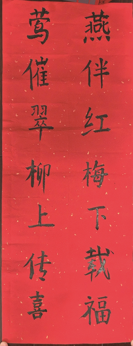 “那么,现在我们就把这份巧思写到红纸上。”孙子有一定的软笔书法基础,所以写起来并不怯场。然而,每个字单独看还不错,但整体一看,从上到下斜出去了。我拍拍他的肩说:“爷爷帮你。”我把红纸横竖折了几道痕线,形成了一个个方格。他重新蘸墨,悬腕提笔,每个字稳稳落在纸上。十几分钟后,孙子高兴地喊道:“爷爷,我写好了!”我退后半步,眯起眼端详。“燕”字稳重,“莺”字端庄,“伴”字左右揖让相得益彰,“梅”的木字旁略瘦,却恰好衬出右边的饱满。虽说笔力还嫩,可字里行间已经有了生机勃勃的春意。