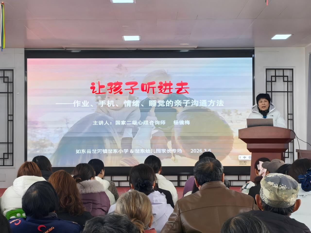 “孩子一拿起手机就放不下,怎么说都不听,怎么办?”在如东县岔河镇岔东学校与岔东幼儿园联合举办的课堂上,国家二级心理咨询师杨镜梅的问题一抛出,现场百余位家长立刻竖起了耳朵。