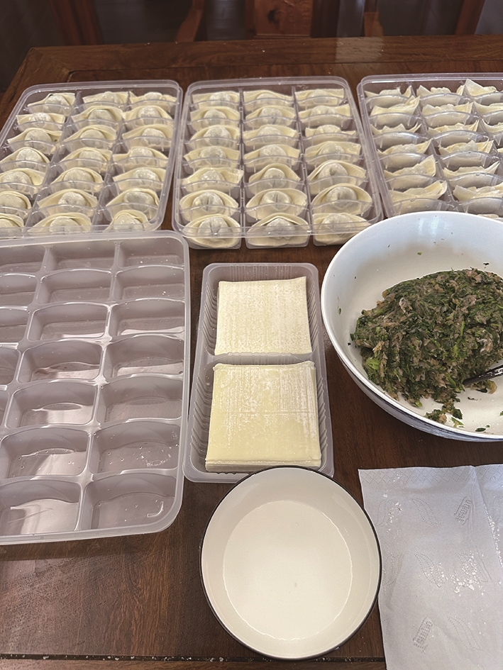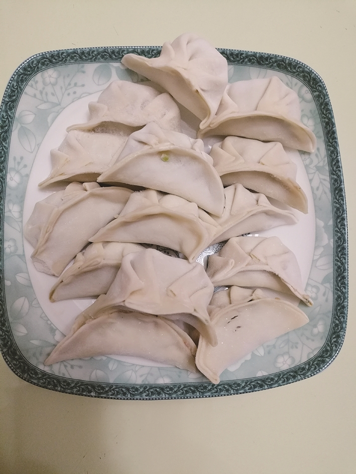 归家后,我仔细择洗、细细剁碎,与鲜肉拌匀,油润清香的馅料很快备好。妻子将薄薄的饺皮托在左掌心,右手夹一撮馅料放上,轻轻将饺子皮向上对折,双手沿着半圆的边缘飞快地轻捏。刹那间,一圈精致的褶子在指尖展开。青瓷盘里,一只只饺子圆润可爱,像酣睡的婴孩。不过一个时辰,饺子已齐整地摆满一桌,静待下锅。