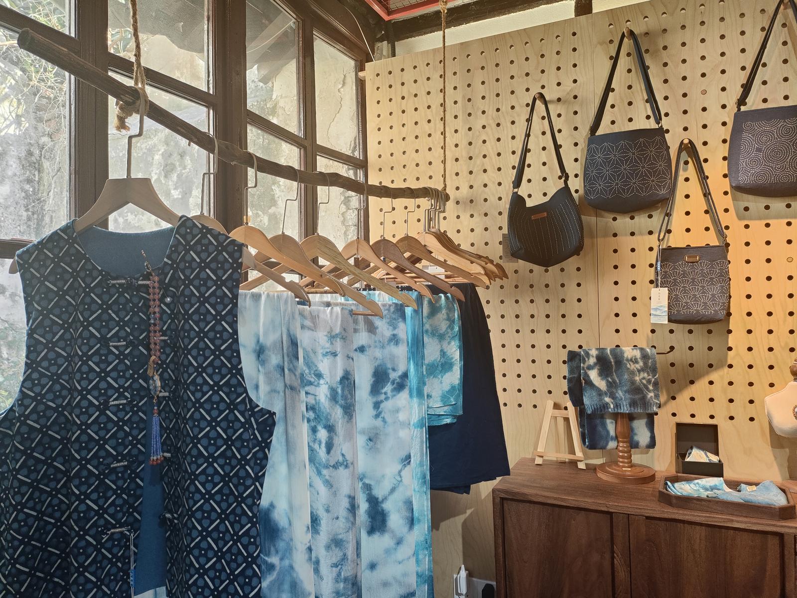 两只憨态可掬的蓝染布艺小熊端坐在店外的木椅上,年轻人三五成群,围着它们拍照打卡。推门而入,像是掉进了一片靛蓝色的梦境,布艺挂饰、手作首饰、衣裙包袋……每一件蓝染作品都在光影里静静呼吸。