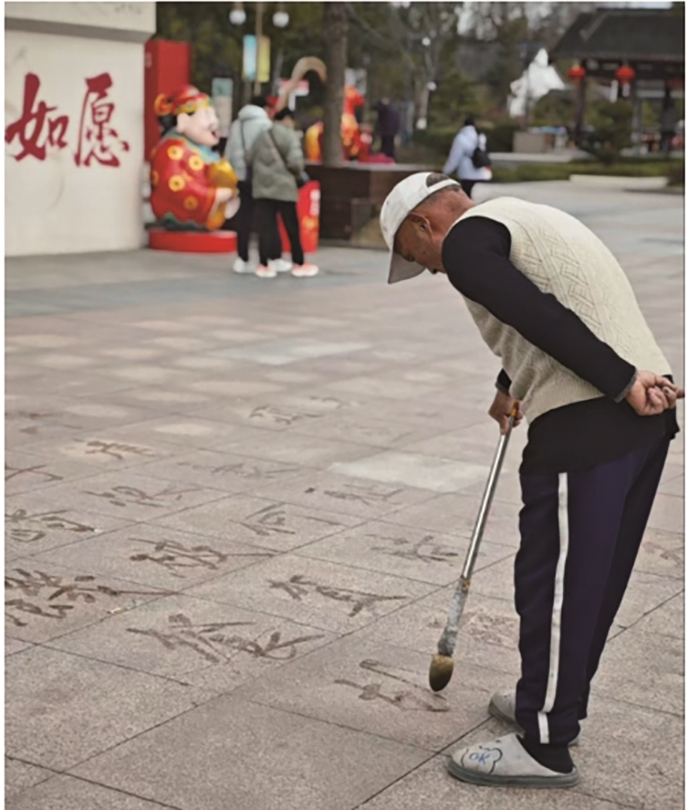 难得天晴,便和父母去爬狼山。走到请香台处,梵烟缭绕,白墙之上红漆写就的“如愿”二字赫然醒目。往来之人多是有求有盼,求一炷香,许一个愿,盼健康平安,盼前程顺利。转身之际,只见一位老人正以地为纸、以水为墨,在台前的青灰地砖上写字。因我也习过几年毛笔字,便忍不住驻足观望。
