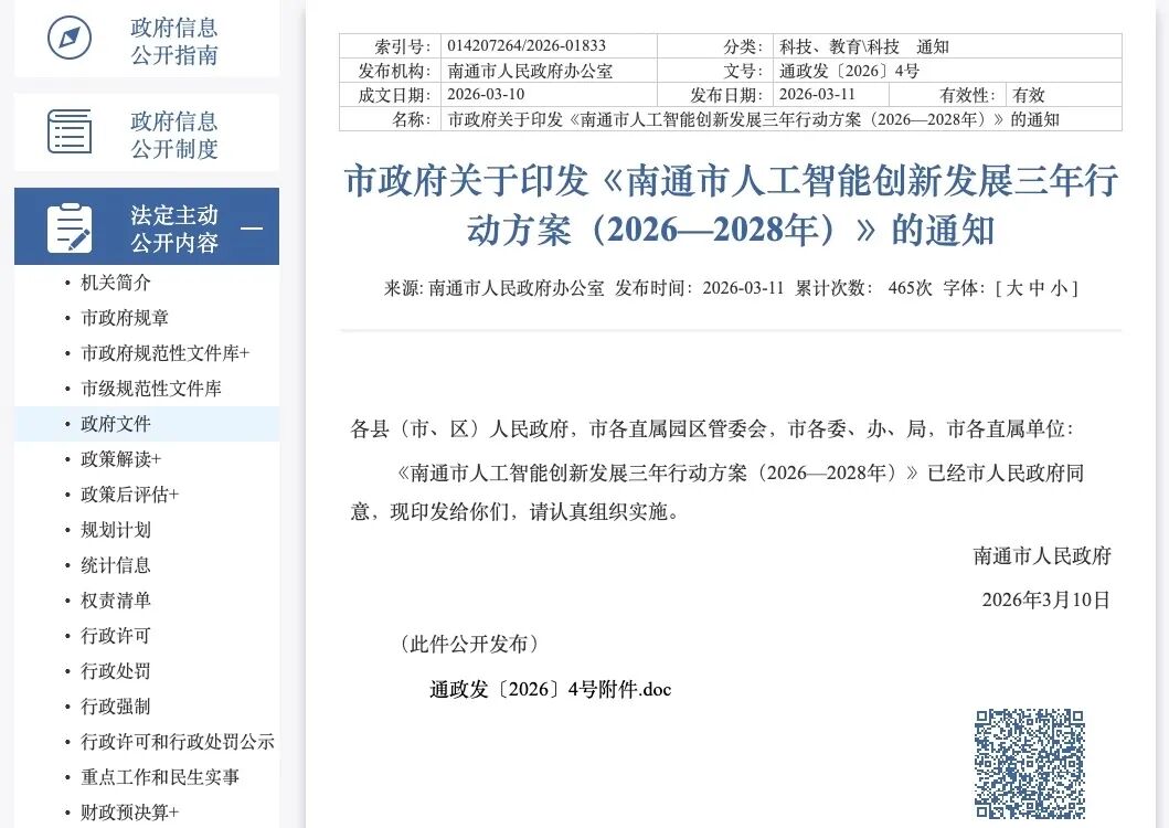 近日,我市正式印发《南通市人工智能创新发展三年行动方案(2026—2028年)》(以下简称《方案》),提出要开展产业集群培育壮大行动、“人工智能+”行动、创新生态优化行动及基础底座夯实行动,目标到2028年,全市智能算力资源供需高效匹配,高质量数据集建设成效明显,人工智能核心产业规模快速增长,人工智能在重点领域实现广泛深度融合,形成一批具有引领性、标志性的示范应用场景和典型应用案例,长三角人工智能特色应用和创新发展城市建设初具雏形。