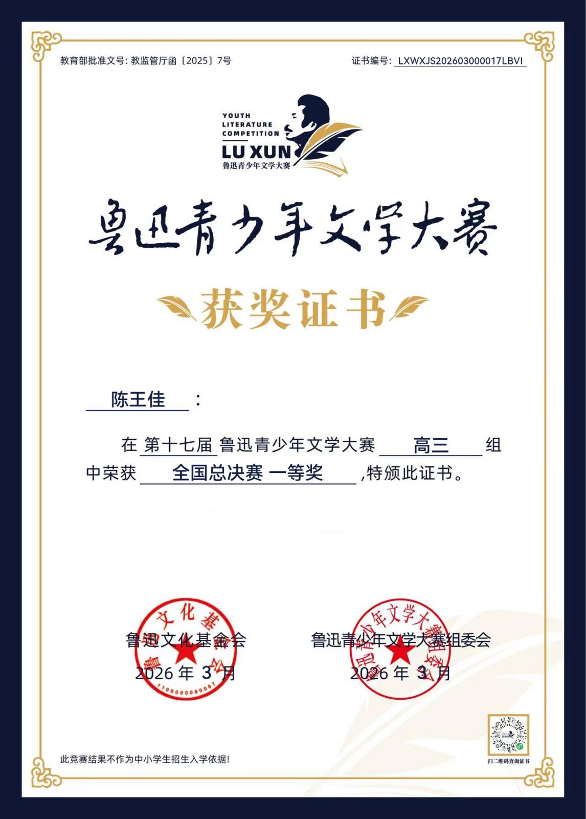 陈王佳赛后表示,在高三紧张的学习生活中,文学成为他调节情绪、寻找内心宁静的重要方式。“闲暇时,我喜欢读鲁迅先生的作品,他文字里的冷峻、热血与悲悯深深地震撼着我,让我明白真正的写作是直面生活的勇气和独立思考的担当。”她说,老师教会她用文字感知世界、表达思想,学校为她提供了阅读与创作的文学天地,她将把这份荣誉化为前行的动力,全力以赴迎接高考。