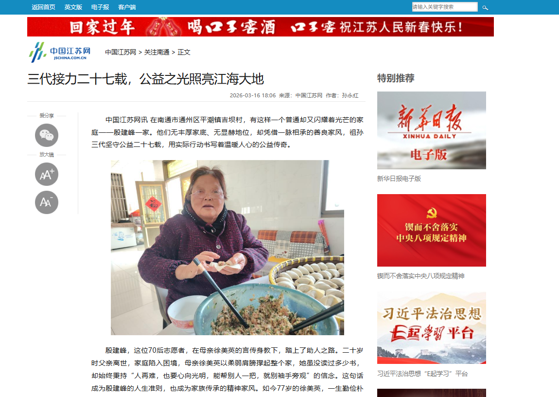 一家三代“爱心接力”风雨数十载!国内媒体关注“江苏好人”殷建峰及其家人