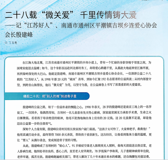 生活在我们身边的平凡一家,默默奉献爱心、无私帮助他人。17日,记者了解到刚刚出版的由中华人民共和国民政部主管的《中华志愿者》期刊,以及中国江苏网等网媒平台,报道了村民殷建峰一家三代、风雨数十载的“爱心接力”。