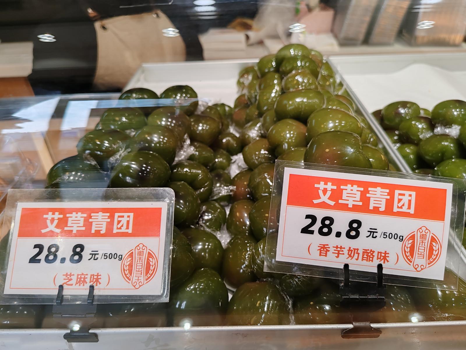 像青葱一样娇俏的小姑娘指着洁净货架上展示的各式青团介绍说,艾草青团是不少南通人最喜欢的“当红口味”,分为传统的芝麻味、香芋奶酪味,价格为每500克28.8元;红豆豆沙味的卖得也很不错,还有些人独独偏爱蛋黄肉松味儿的那一款,不过,这一款口味的因食材成本高一些,因此价格要比芝麻味、香芋奶酪味儿、红豆豆沙味的贵些,为500克36.8元;尽管后者价格明显高了许多,但还是受到不少消费者的青睐,因为蛋黄肉松除了营养成分更丰富外,那微甜和微咸掺杂的独特味道,还是让许多喜爱者欲罢不能。
