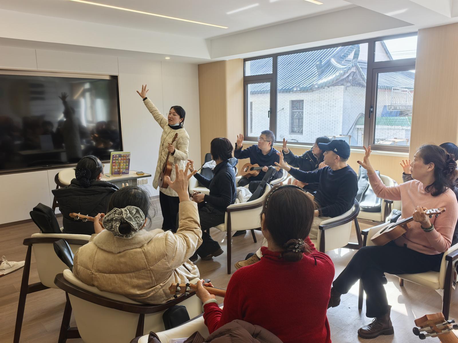 走进尤克里里教室,学员们在老师指导下,认真学习调音、识谱。“年轻时热爱音乐、喜欢唱歌,但没时间也没条件系统学习。现在退休了,家门口就有这么好的学习场地,收费也亲民,终于圆了我的音乐梦。”刚退休的李峻一边调试琴弦,一边笑着说道。