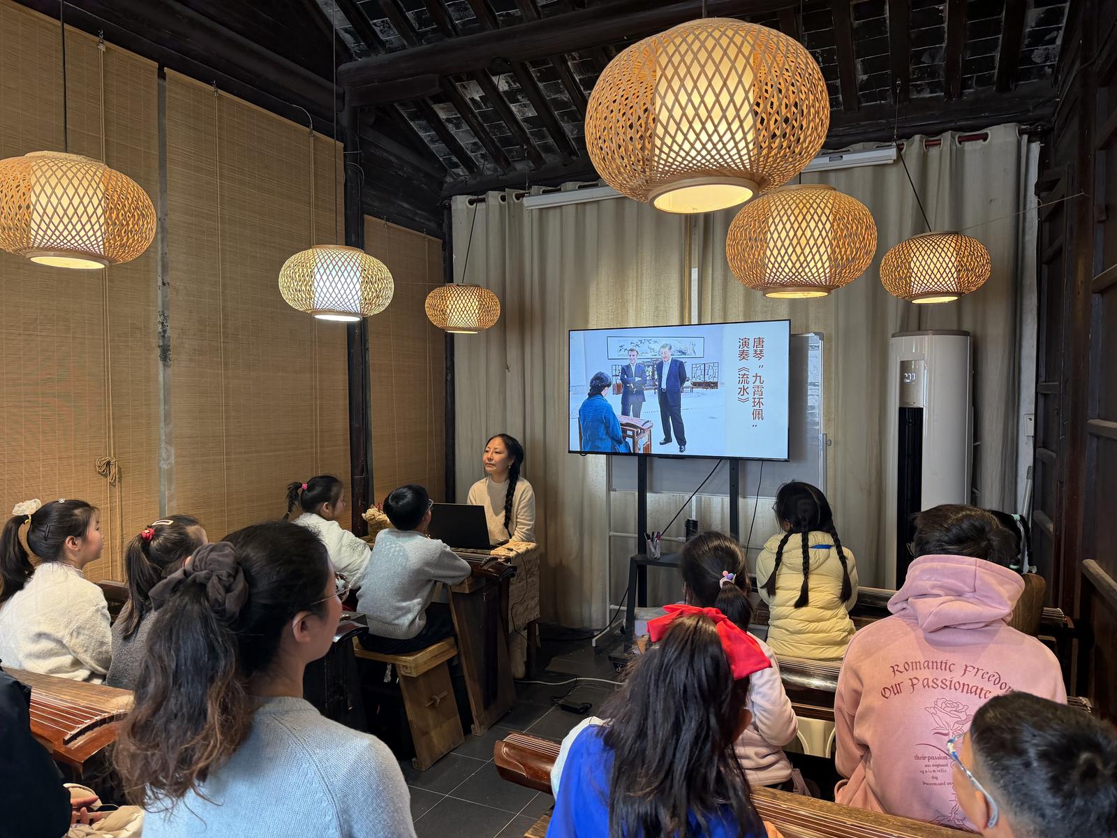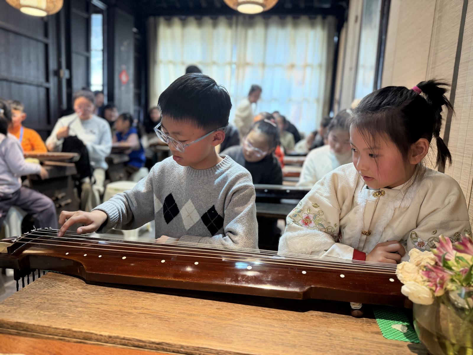 “古琴,被称为‘圣人之物’‘传道之器’。”活动开始,王娅妮轻抚琴面,从古琴的前世今生讲起。小记者们两人一桌,聚精会神地聆听,不时发出惊叹。