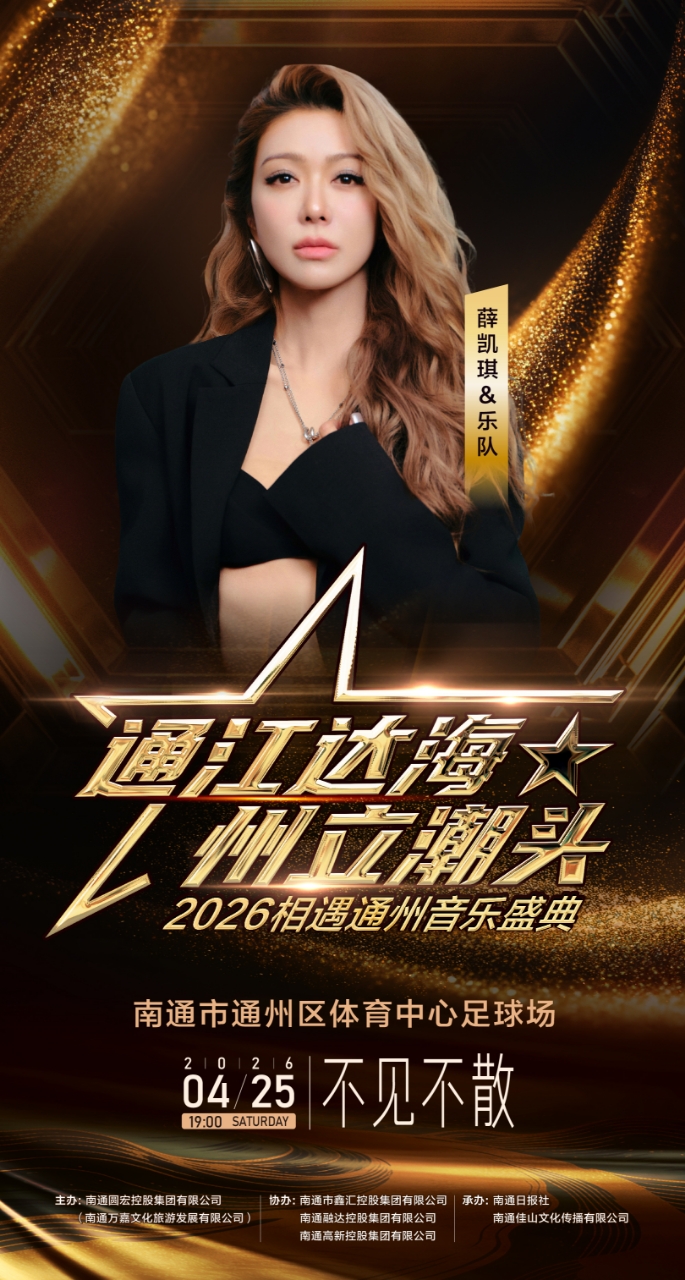 4月25日晚,南通市通州区体育中心足球场,2026相遇通州音乐盛典,让这一方草地成为今春炙热的情感地标。薛凯琪将携手萧敬腾、姜育恒、唐艺等实力唱将齐聚一堂,用一首首写满回忆的经典曲目引爆现场!