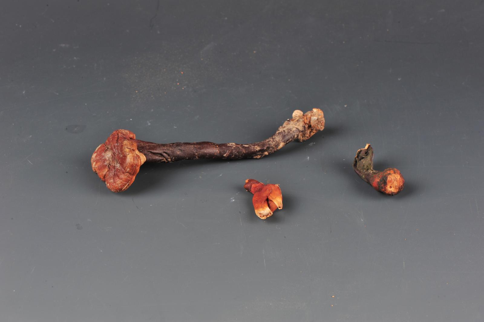 众人赶紧走近察看,一株倒伏腐朽的大树上,生长着50多株野生灵芝,长势旺盛。其菌盖呈半圆形或肾形,直径2.7—15.2cm×4.3—18.4cm,厚度0.4—2.4cm,菌盖呈黄色和嫩黄色,属于生长期灵芝。形态特征与《中华人民共和国药典》收录的法定药用品种赤灵芝(Ganoderma lucidum)高度吻合,专家现场初步判定为赤灵芝。