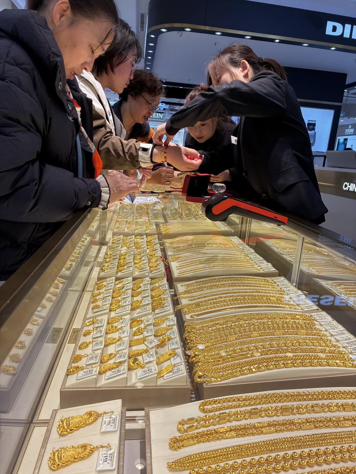 近日,国际金价一路走低。受金价“跳水”影响,国内多家金店足金饰品价格下调。3月23日至24日,记者在南通文峰大世界看到,不少市民前来看金、试金,消费市场保持平稳态势。
