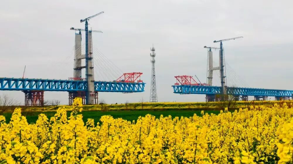 在金黄的油菜田簇拥之中,大型机械轰鸣作响,施工现场热火朝天。全线1000余名建设者奋战在关键点位,全力冲刺4月初主桥第五节钢梁吊装节点。
