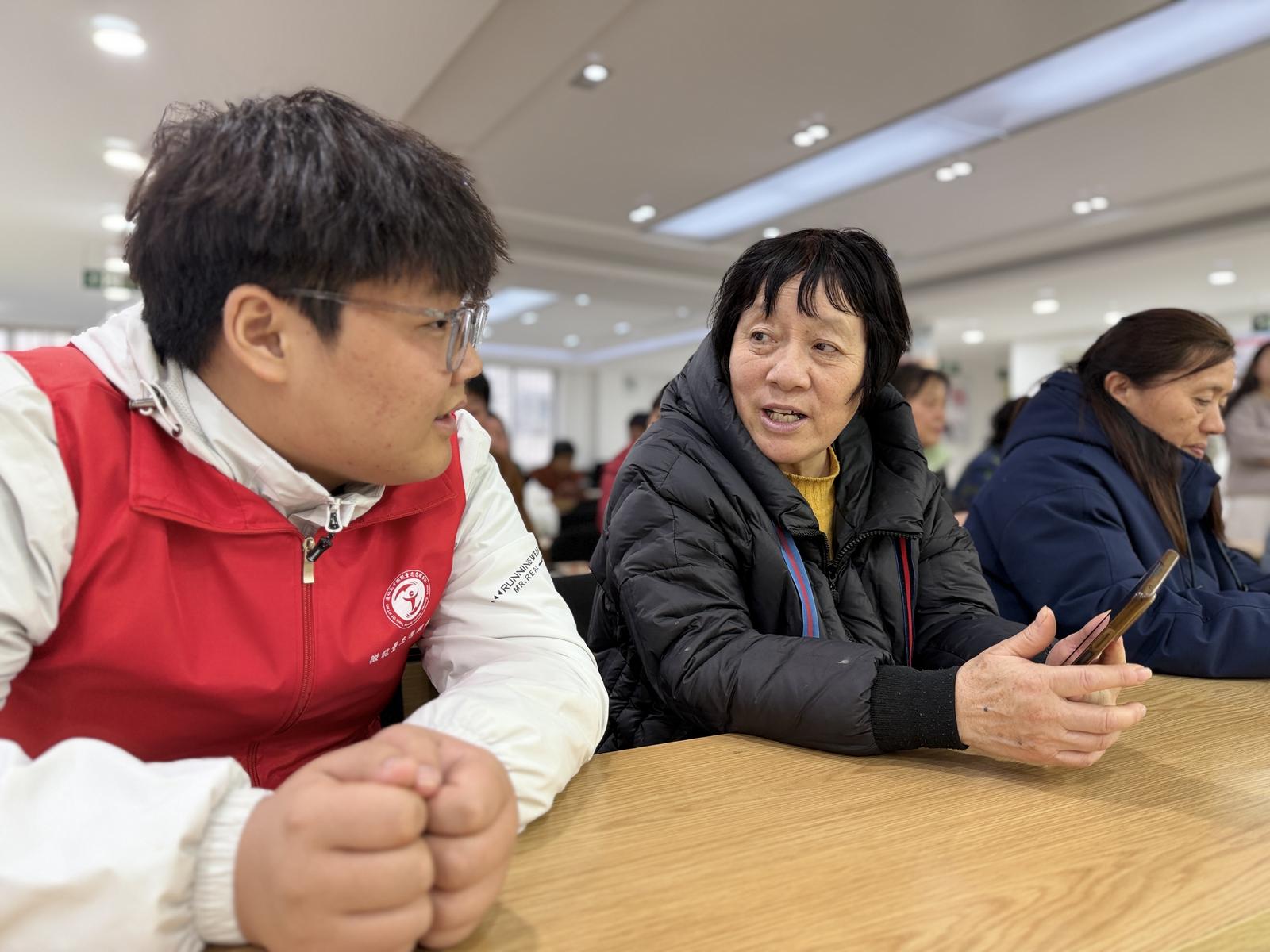 “微能量”志愿服务团队负责人蔡佳艳告诉记者:“来之前和社区沟通过,老人普遍反映想学怎么用AI软件,我们就重点安排了这方面内容,教他们下载豆包、使用各种功能。目前团队有50多位志愿者,今天安排了9名志愿者来辅导。”