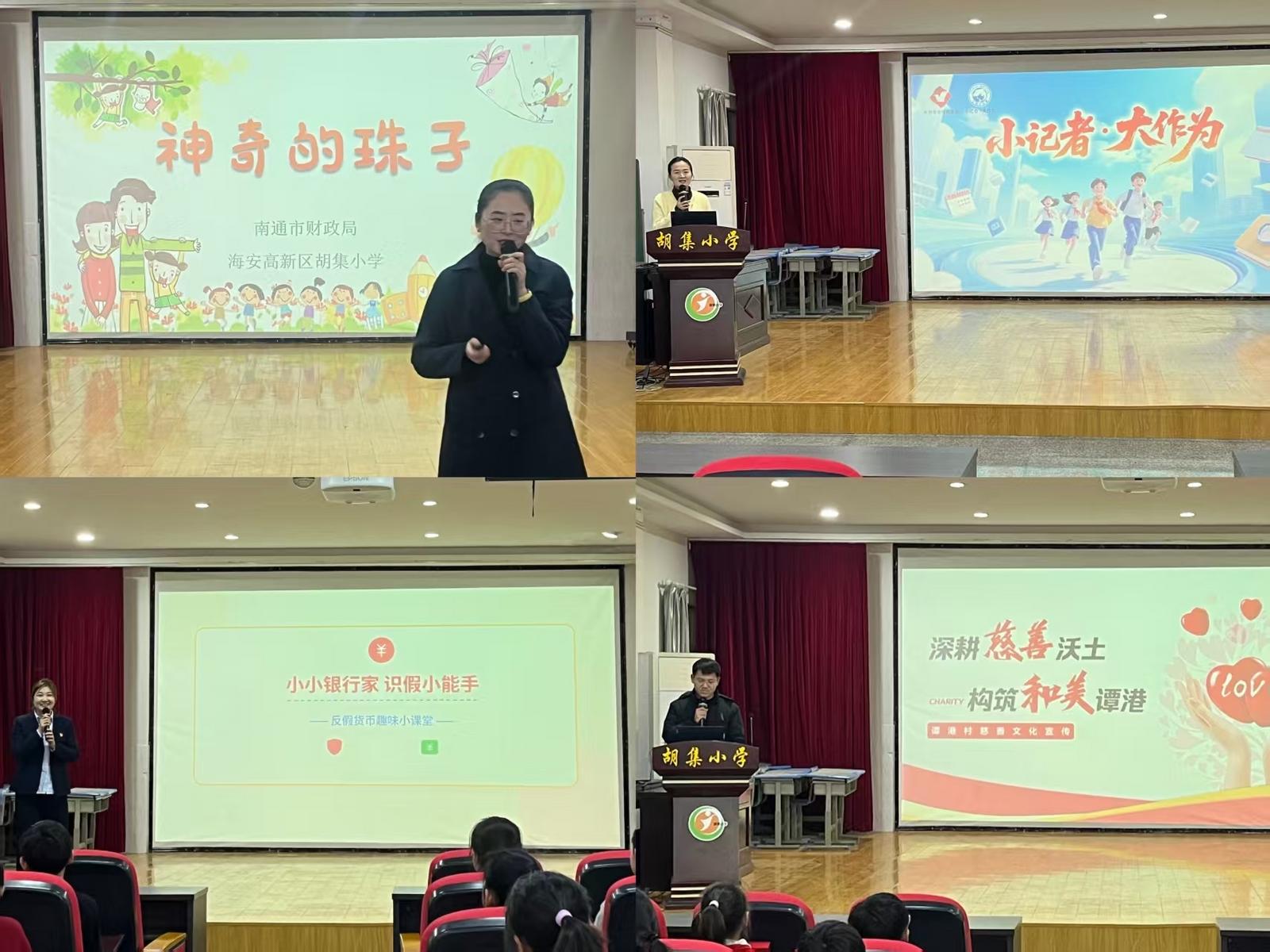 活动中,青年们走进海安市胡集街道胡集小学,开启暖心送教环节。来自珠算博物馆的讲解员用生动的故事、直观的演示,带领孩子们走进古老的珠算文化,感受非遗魅力;日报社青年记者现场推介“江海小记者”项目,鼓励孩子们多观察、多写作,用文字记录家乡变化;邮储银行海安市支行青年骨干用通俗易懂的语言,讲解人民币反假识别、防诈骗手段等知识,帮助孩子们树立正确的金钱观与消费观。胡集街道谭港村慈善文化宣传同步开展,向善、互助的理念在课堂上悄然传递。