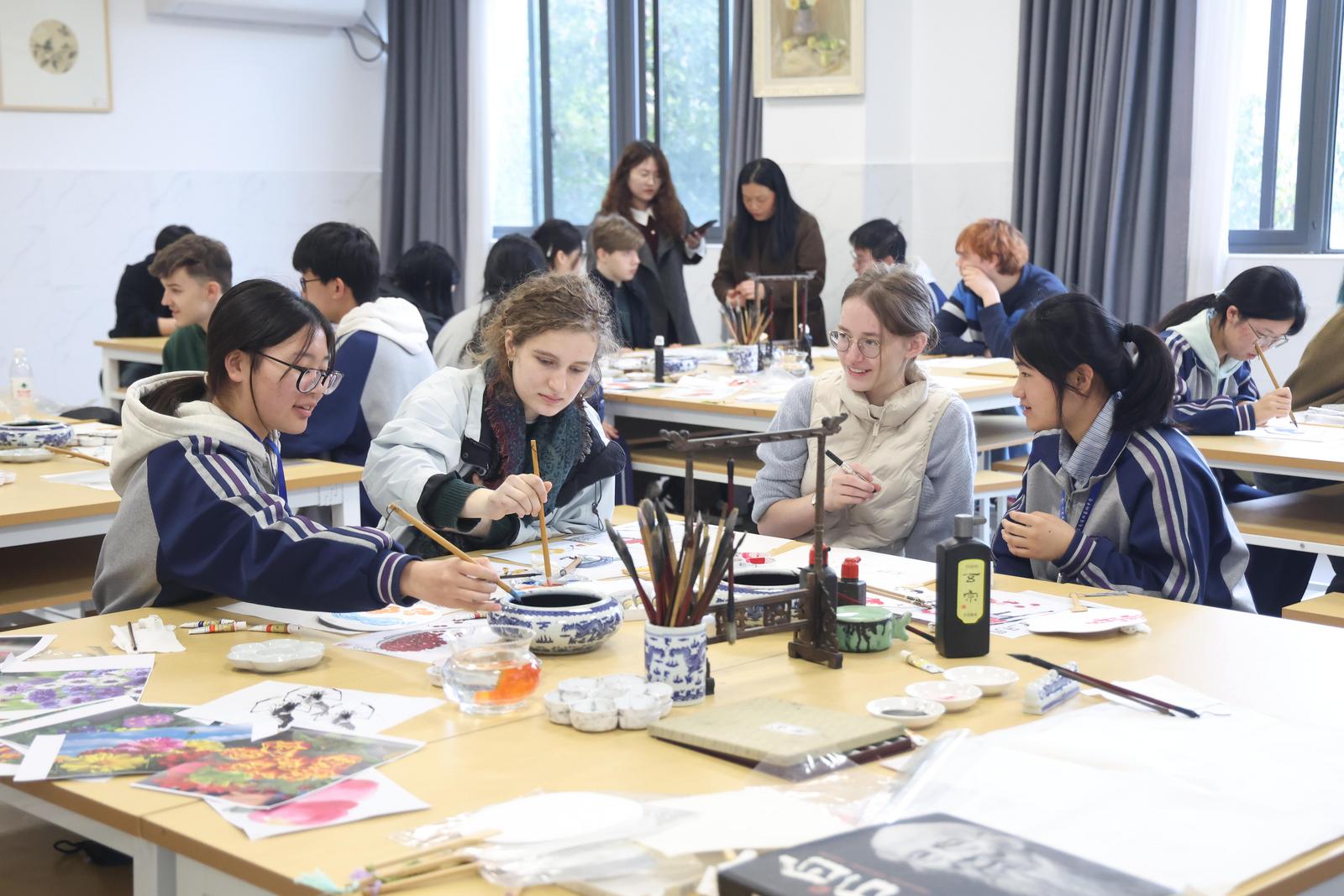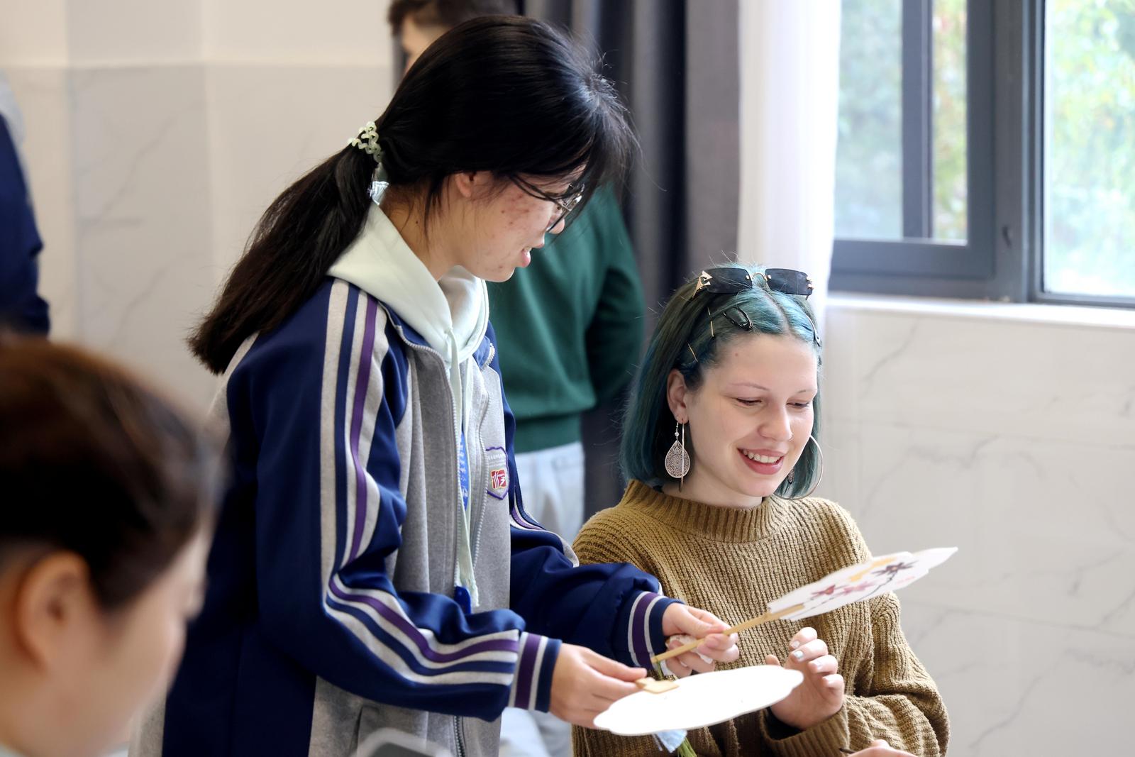 26日上午,德国哈勒华德福学校的师生们在田家炳高中体验扇面绘画。在该校的美术教室,来自德国的高中生用水墨在扇面上勾勒出各种图案,有鲜花,有山水,很多学生第一次接触到这种艺术形式,十分好奇。
