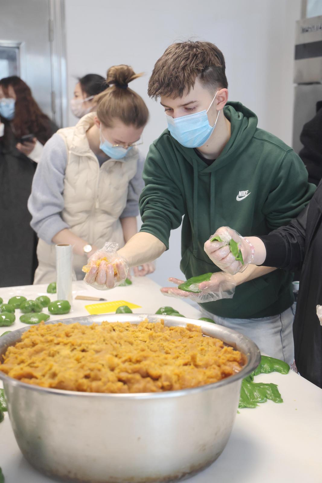 26日,德国哈勒华德福学校师生代表团来到南通四宜糕团店,学习制作青团。据了解,在南通的三天时间内,该代表团将感受南通城市面貌,体验非遗和民俗项目,并参观江苏省南通田家炳中学以及海门东洲中学。