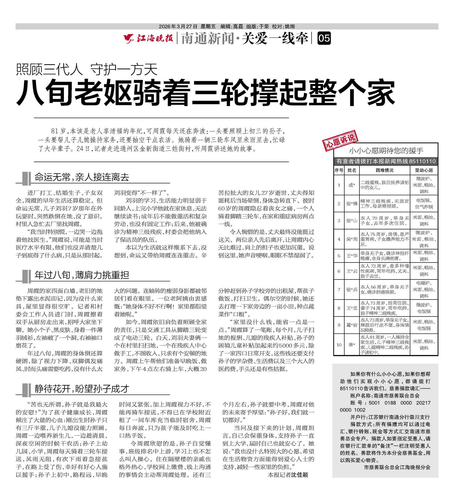 81岁,本该是老人享清福的年纪,可周霞每天还在奔波:一头要照顾上初三的孙子,一头要帮儿子儿媳操持家务,还要抽空干点农活。她骑着一辆三轮车风里来雨里去,忙碌了大半辈子。24日,记者走进通州区金新街道三姓街村,听周霞讲述她的故事。