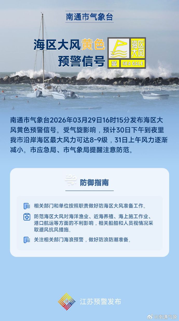 南通市气象台2026年03月29日16时15分发布海区大风黄色预警信号。受气旋影响,预计30日下午到夜里我市沿岸海区最大风力可达8-9级,31日上午风力逐渐减小。市应急局、市气象局提醒注意防范。