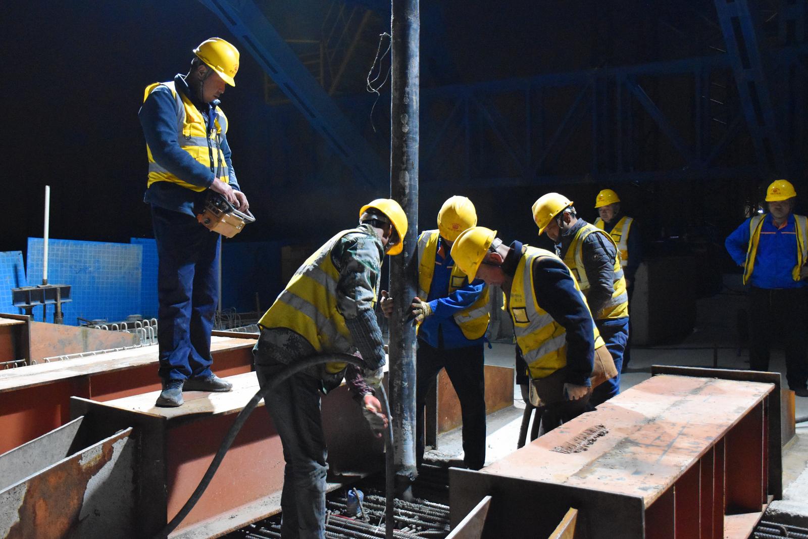 在浇筑前期,施工人员严格按照专项方案,采用型钢构件对合龙段两侧悬臂端实施刚性连接锁定,形成稳定的受力框架,有效防止混凝土在初凝阶段受到扰动。项目部严格执行夜间低温时段浇筑作业,综合运用临时锁定、张拉临时预应力束及同步卸载配重等工艺措施,精准控制合龙精度与成桥线形。在合龙浇筑关键阶段,项目部组建专项技术小组,对桥梁线形、温差等核心参数实施全过程监控,通过监测设备实时采集数据,动态调整施工参数,确保合龙精度满足设计要求。同时,项目严格落实安全穿透式管理制度,全过程实现安全、稳定、受控。