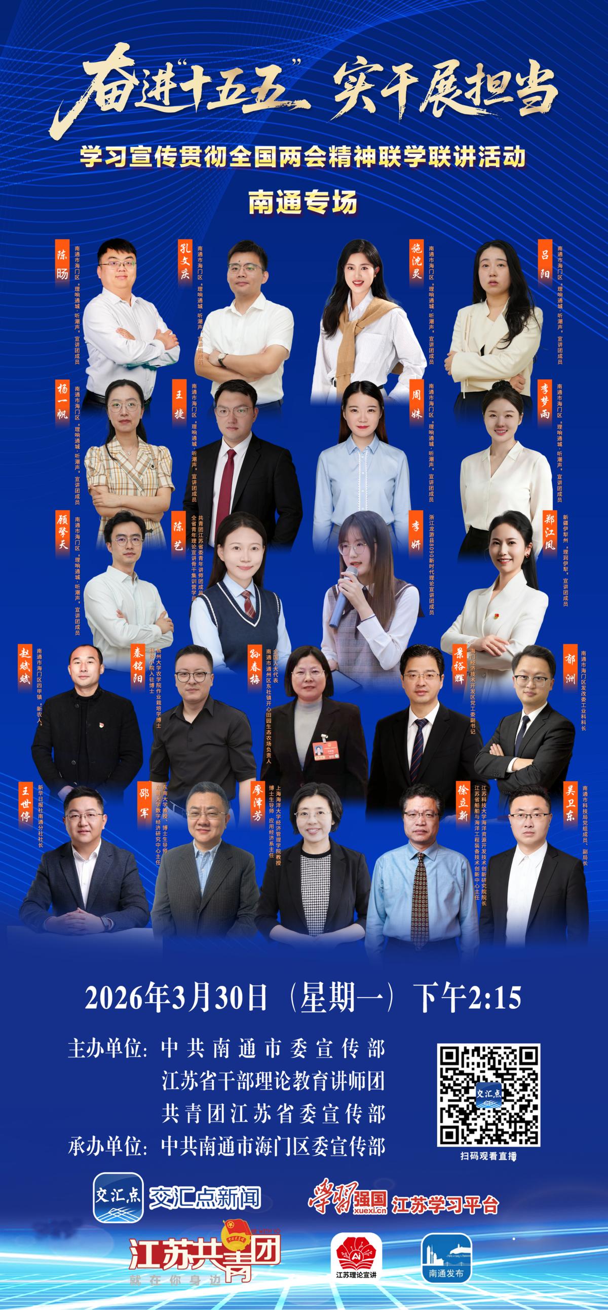 为深入学习宣传贯彻全国两会精神,由中共南通市委宣传部、江苏省干部理论教育讲师团、共青团江苏省委宣传部、中共南通市海门区委宣传部共同策划推出“奋进‘十五五’ 实干展担当”学习宣传贯彻全国两会精神联学联讲活动。