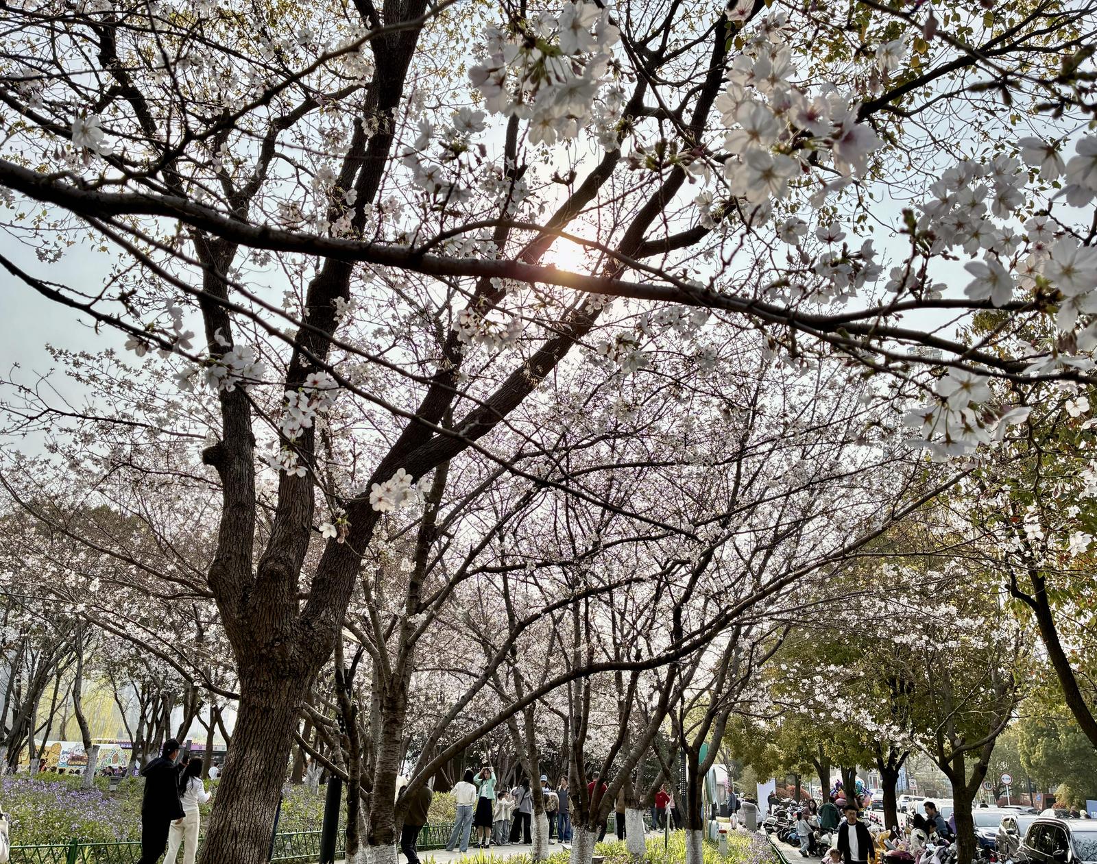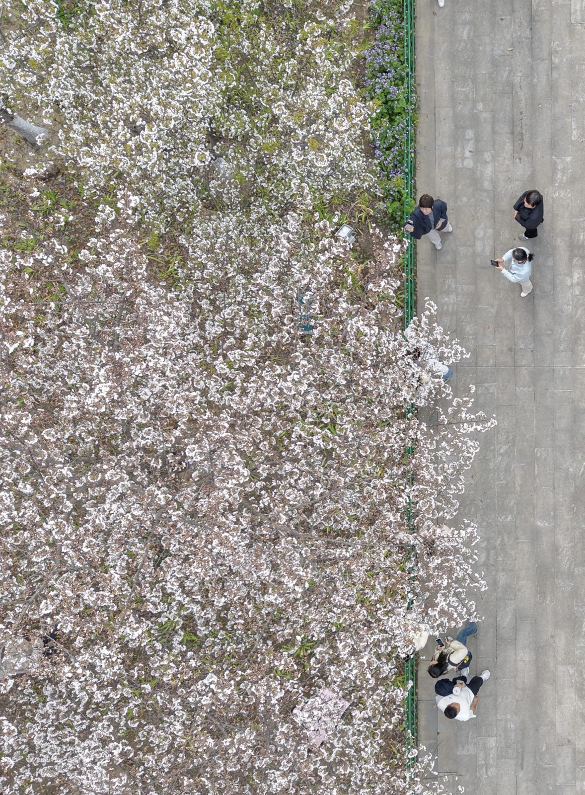 漫步通吕运河北岸绿廊,数百米长的樱花道上,一株株樱花树错落有致,枝头缀满了盛放的花朵,有的含苞待放、娇羞欲滴,有的肆意舒展、烂漫多姿,粉白花瓣层层叠叠。微风拂过,花瓣簌簌飘落,铺就出一条“粉色花径”,空气中弥漫着淡淡的花香,沁人心脾。不少人身着浅色系服饰,在花下拍照留念,捕捉春日的温柔瞬间。下午4至5点的柔和阳光,更让每一张照片都自带“春日滤镜”。