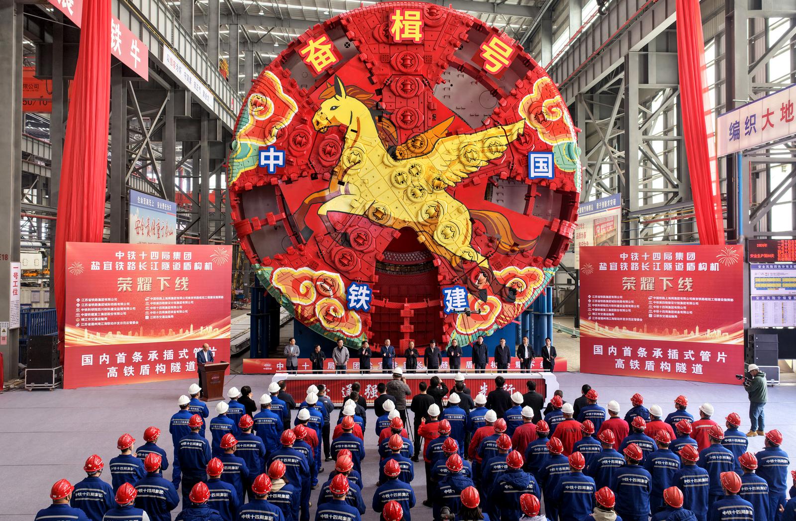 2026年3月31日,由中铁十四局与铁建重工集团联合打造的超大直径盾构机“奋楫号”在通州湾示范区下线,将被用于新建盐宜高铁长江隧道工程。该工程是国内首条采用承插式管片的高铁盾构隧道,隧道的建设将推动我国超大直径水下盾构隧道向全智能建造时代迈进。