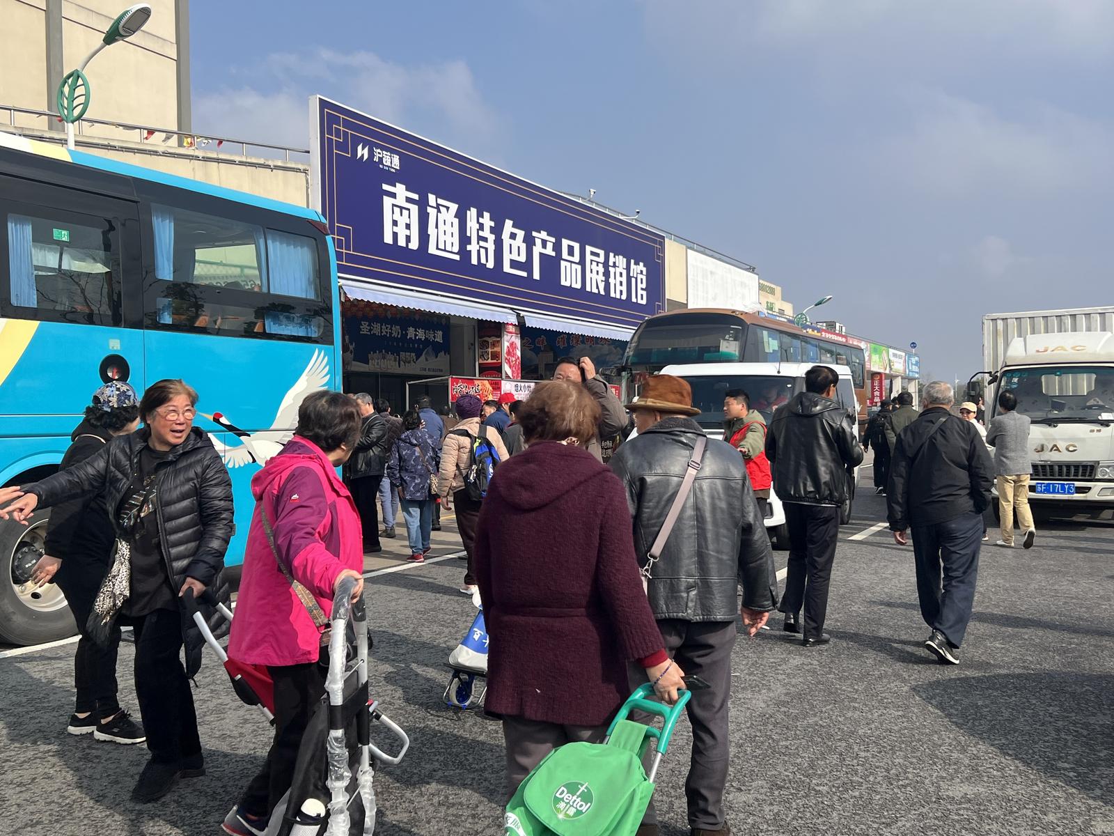 上午9时许,沪蔬通市场内的南通特色产品展销馆前,10辆大巴车有序停靠。来自上海的50人团队、苏州的50人团队,以及海安、如东、通州、启东等县(市、区)的360余名游客齐聚于此。为庆祝开通一周年,原价55元/位的“寻味南通”专线推出特惠价:上海往返仅需29.9元。值得一提的是,苏州线路首次开通,为吸引客流、培育市场,特推出1.99元的超值体验价。“周年庆优惠吸引了不少回头客,很多市民已经是第三次、第四次来了。”上海团领队介绍。而在启东恒大威尼斯区域,居民自发形成“组团采购”模式,由联络人统计需求、协调车辆,极大方便了消费者出行。
