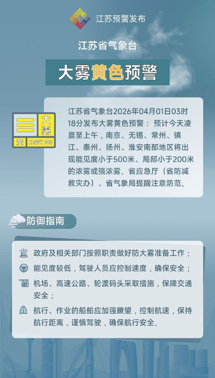 江苏省气象台2026年04月01日03时18分发布大雾黄色预警: