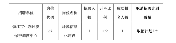 还有两个定向招聘残疾人的岗位,一个是江苏省生态环境厅下属省苏州环境监测中心的生态遥感监测岗位,另一个是镇江市生态环境保护调度中心的环境信息化建设岗位,虽然招录比都只有1:2,但也因为报考人数不足被取消。