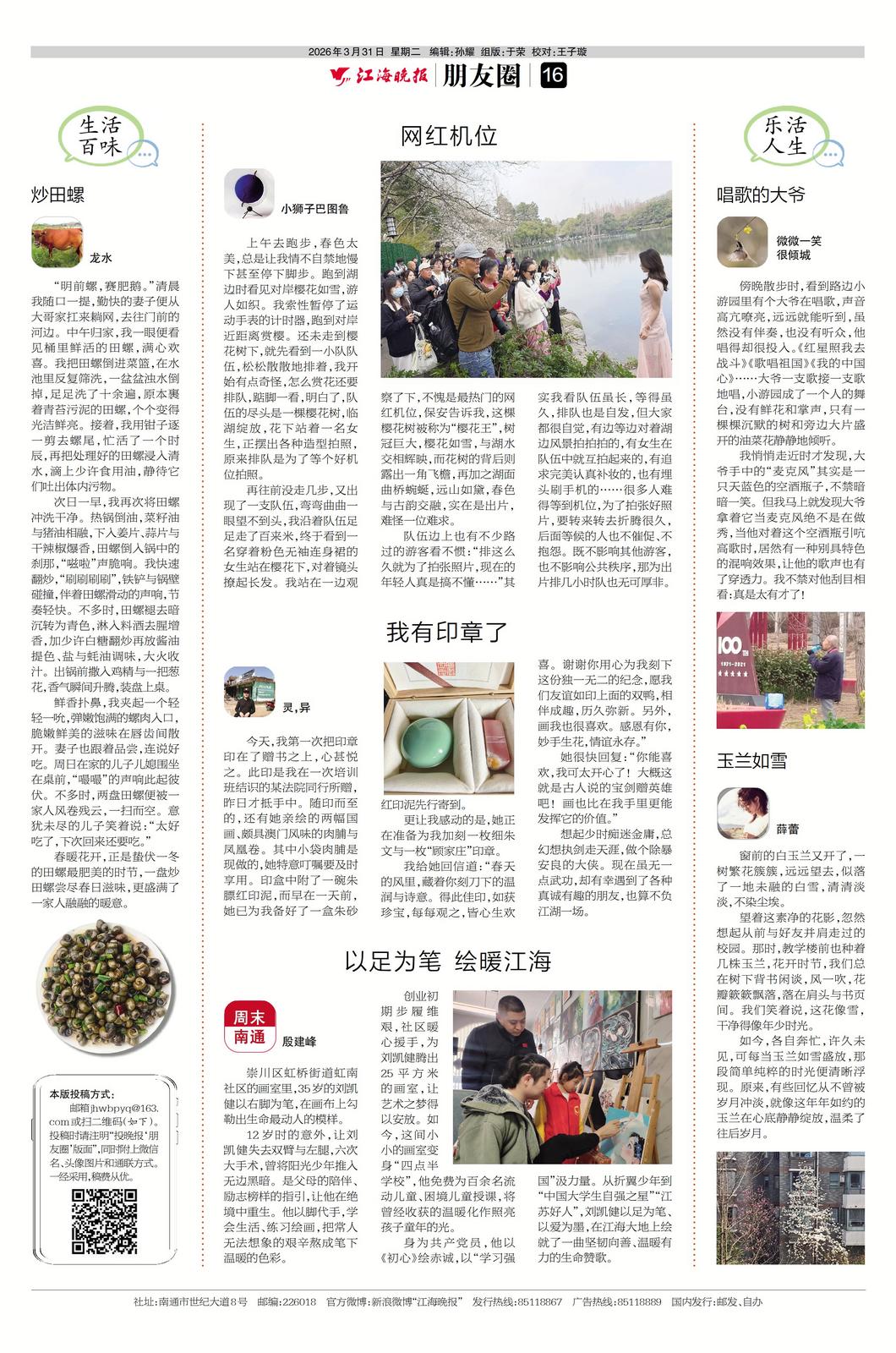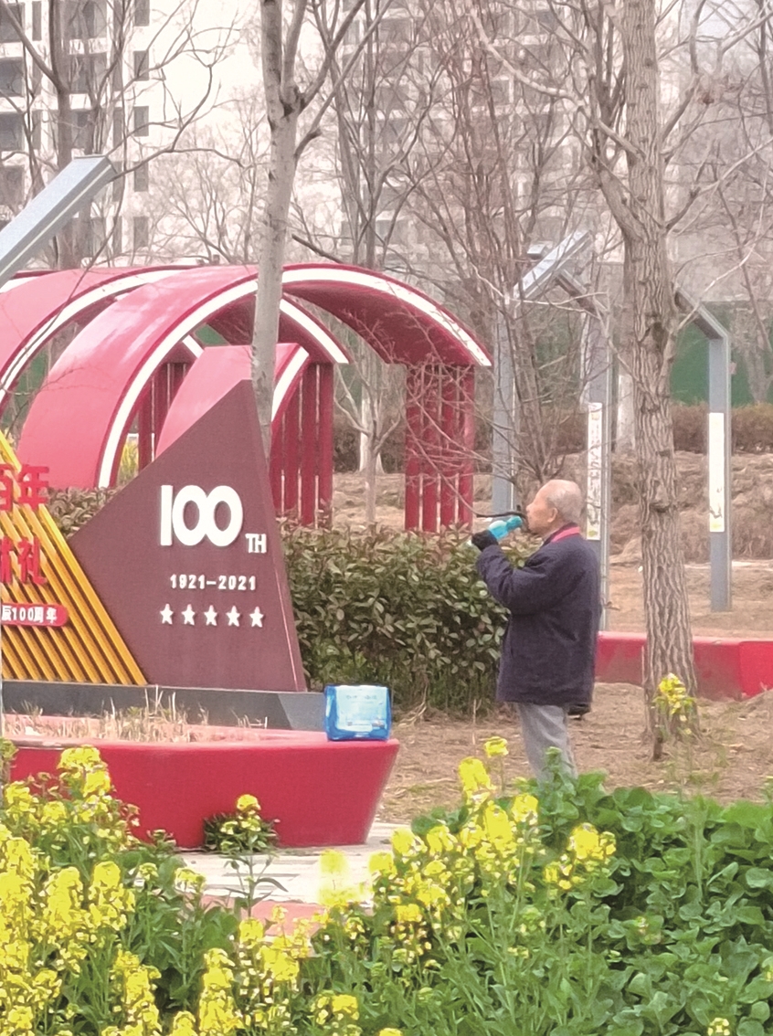 傍晚散步时,看到路边小游园里有个大爷在唱歌,声音高亢嘹亮,远远就能听到,虽然没有伴奏,也没有听众,他唱得却很投入。《红星照我去战斗》《歌唱祖国》《我的中国心》……大爷一支歌接一支歌地唱,小游园成了一个人的舞台,没有鲜花和掌声,只有一棵棵沉默的树和旁边大片盛开的油菜花静静地倾听。