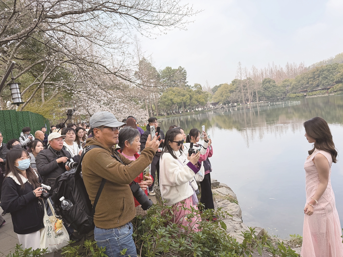 上午去跑步,春色太美,总是让我情不自禁地慢下甚至停下脚步。跑到湖边时看见对岸樱花如雪,游人如织。我索性暂停了运动手表的计时器,跑到对岸近距离赏樱。还未走到樱花树下,就先看到一小队队伍,松松散散地排着,我开始有点奇怪,怎么赏花还要排队,踮脚一看,明白了,队伍的尽头是一棵樱花树,临湖绽放,花下站着一名女生,正摆出各种造型拍照,原来排队是为了等个好机位拍照。