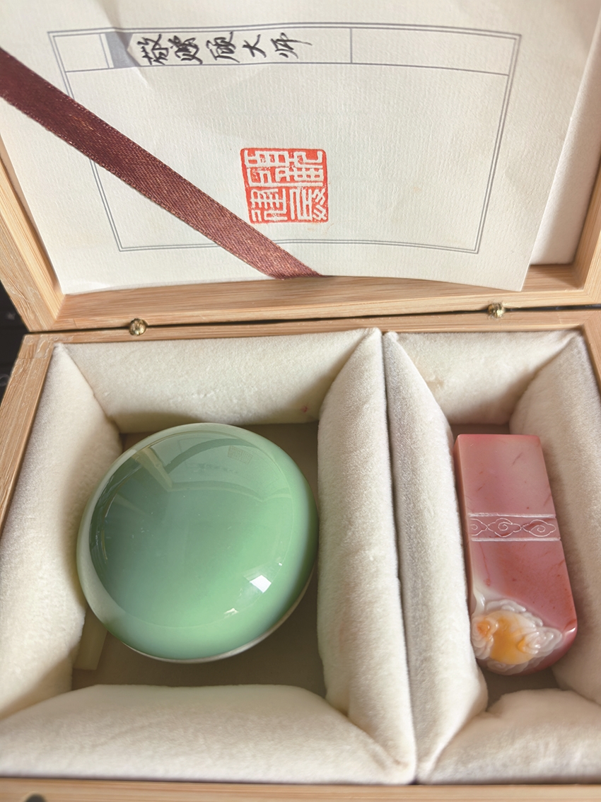 今天,我第一次把印章印在了赠书之上,心甚悦之。此印是我在一次培训班结识的某法院同行所赠,昨日才抵手中。随印而至的,还有她亲绘的两幅国画、颇具澳门风味的肉脯与凤凰卷。其中小袋肉脯是现做的,她特意叮嘱要及时享用。印盒中附了一碗朱膘红印泥,而早在一天前,她已为我备好了一盒朱砂红印泥先行寄到。
