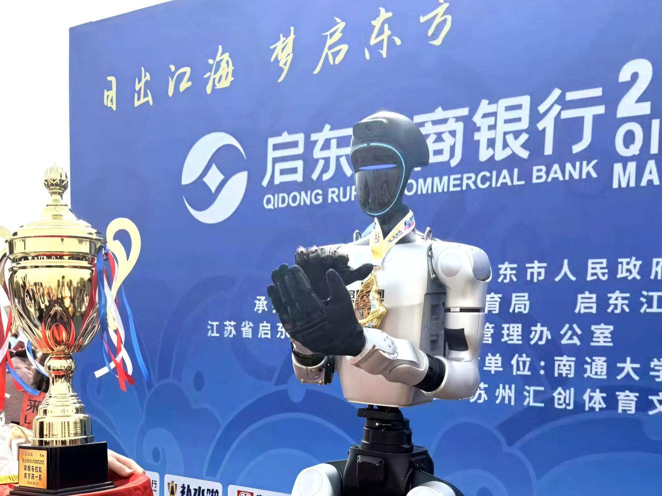 移动AI机器人精彩亮相启动仪式,瞬间点燃现场氛围,比赛鸣枪后,机器人变身“科技陪跑员”,与选手们并肩奔跑在“最鲜公路”上。依托移动5G网络与AI自适应步态算法,它们行进平稳流畅,成为赛道上的“气氛组担当”。不少跑友笑着说:“有机器人陪着跑,感觉更有劲儿了!”颁奖环节中,机械臂同步鼓掌庆祝,用科技感十足的方式为获奖选手喝彩,为赛事画上圆满句号。