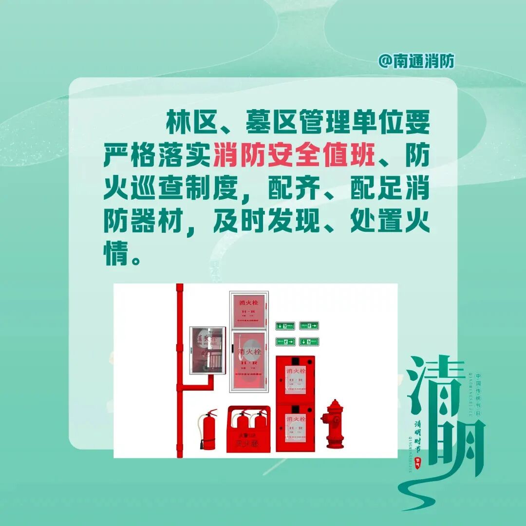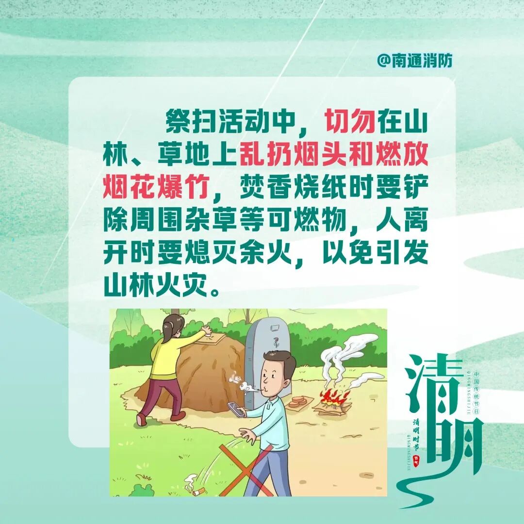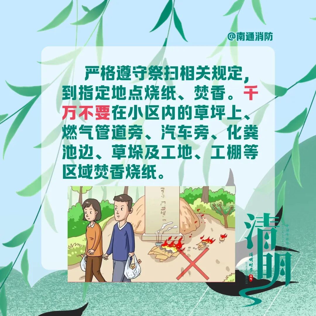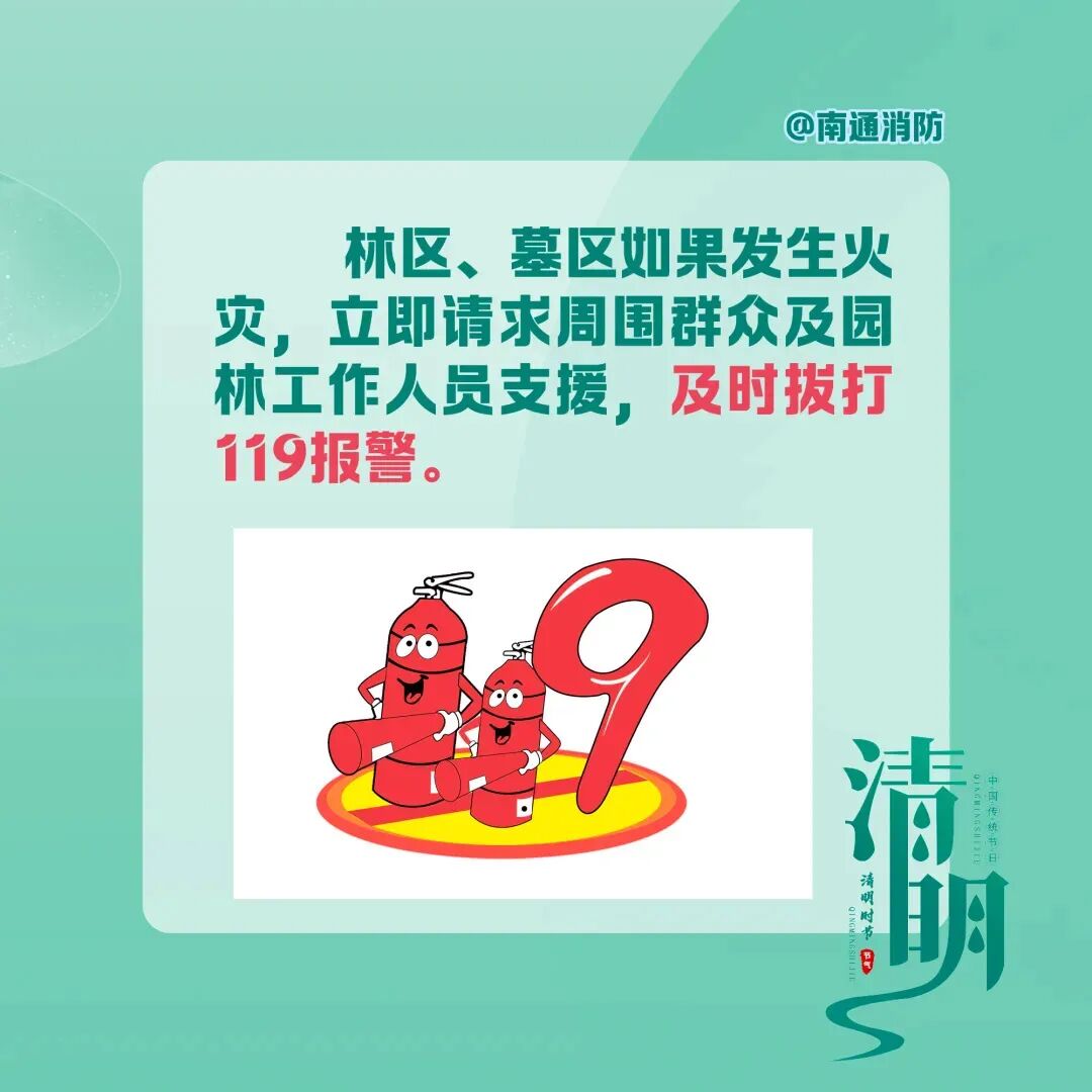 此外,南通消防温馨提醒市民:假期出行,务必遵守消防安全规定。祭扫时人不离火、火灭人离,彻底熄灭余火;踏青露营严控明火、远离易燃物;居家做好“三清三关”(清阳台、清楼道、清厨房,关火源、关电源、关气源)。如遇火情,立即拨打119报警,迅速撤离至安全区域,切勿盲目扑救。