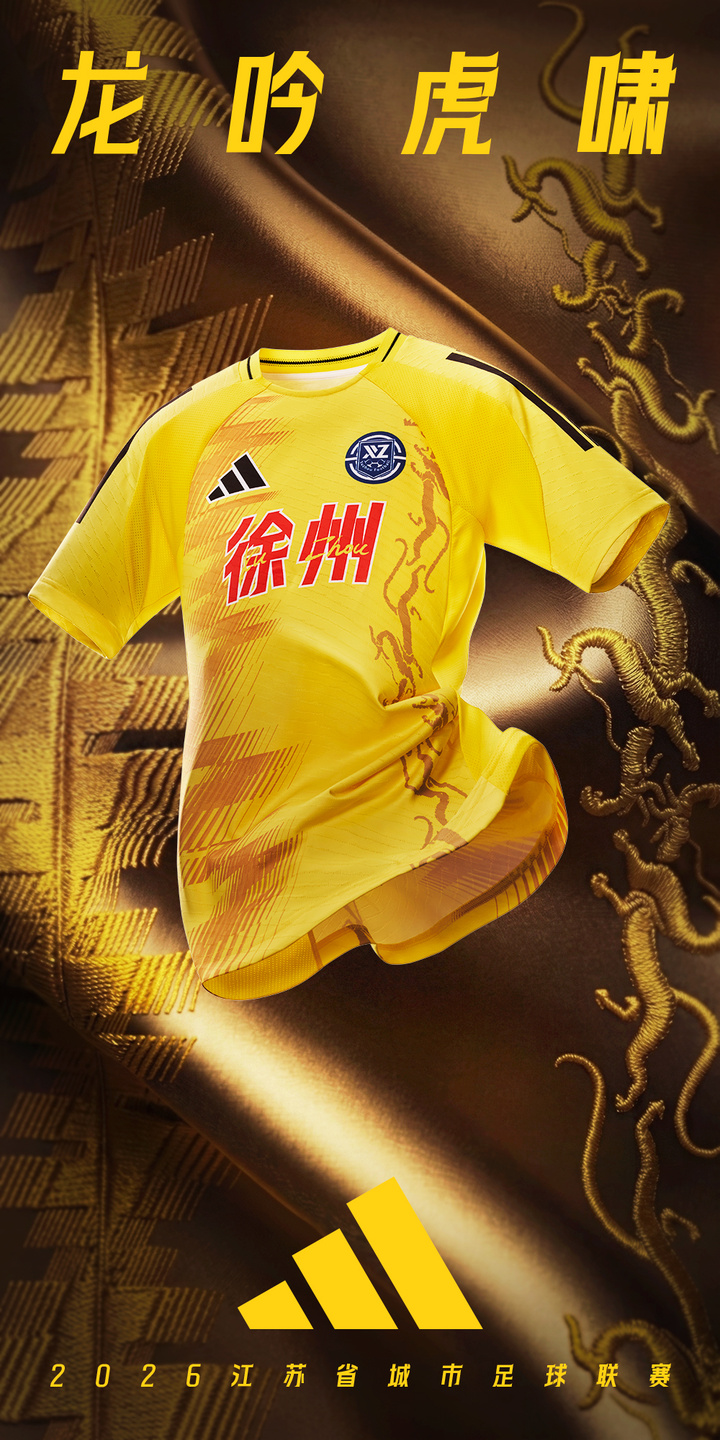 “黄”袍加身,气贯长虹。亮黄底色,以徐州深厚的汉文化为灵感,辅以争霸意向的“汉界”符号和龙纹。黑杠与红字相间,勾勒出“龙吟虎啸”的帝王之相,彰显客场征服的野心。