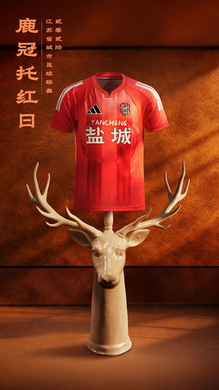 主场比赛服设计提取“麋鹿”这一核心地理标识与精神图腾,巨大的鹿角图案在衣身肆意舒展。暗纹之中,芦苇纹理随奔跑如湿地潮汐般倾泻,将野性与灵动的气韵凝作衣间锋芒。