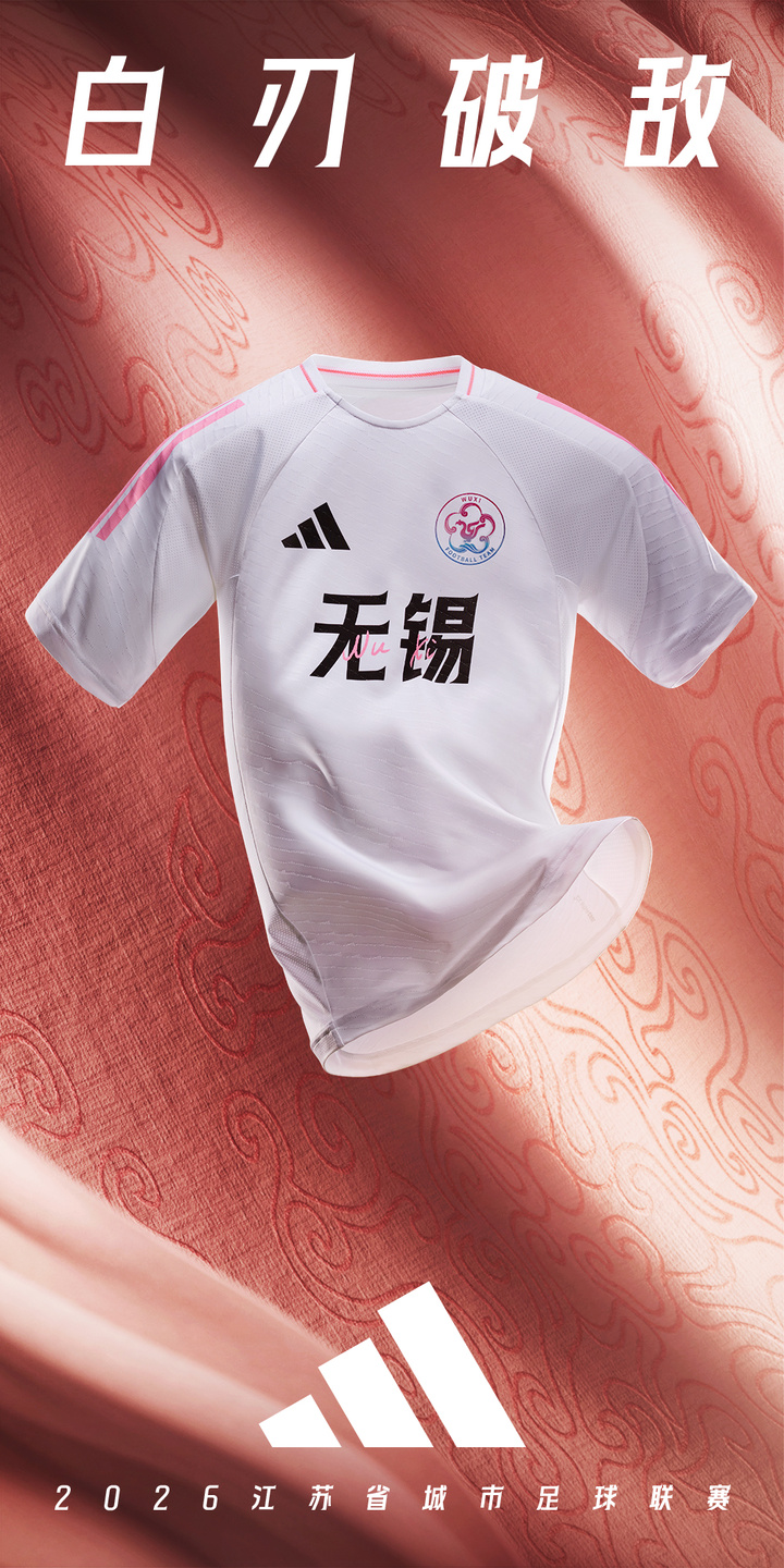 客场战袍化繁为简,以凌厉的纯白为主色。肩部粉色线条作为点缀,与主场一脉相承。粉色代表象征热烈生命力的杜鹃,留白代表上善若水的智慧,至柔之性与至刚之力的结合,映照无锡温润而不失韧劲的城市气质。