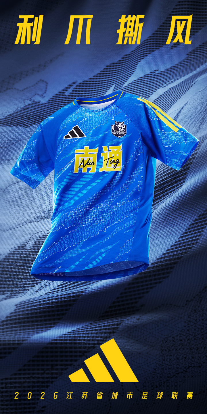 利爪撕风,蓝缬惊芒。客场战袍以国家级非遗“蓝印花布”为灵感。胸前“狼爪”撕开处,清雅的非遗纹样跃然其间。温婉底蕴与凌厉锋芒在此碰撞,尽显南通“包容会通、敢为人先”的城市精神。