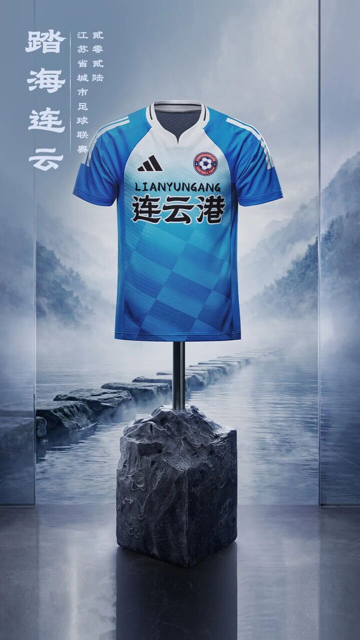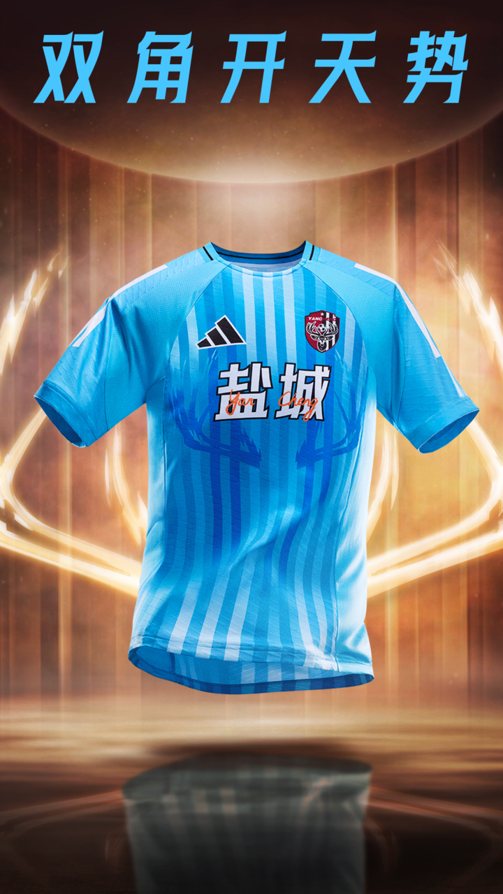 客场比赛服天蓝如波,清雅质感传递出“生态之城”人与自然共生的城市精神。鹿角元素与粼粼光影在衣间交织,将盐城的清新灵秀披作远征战衣。