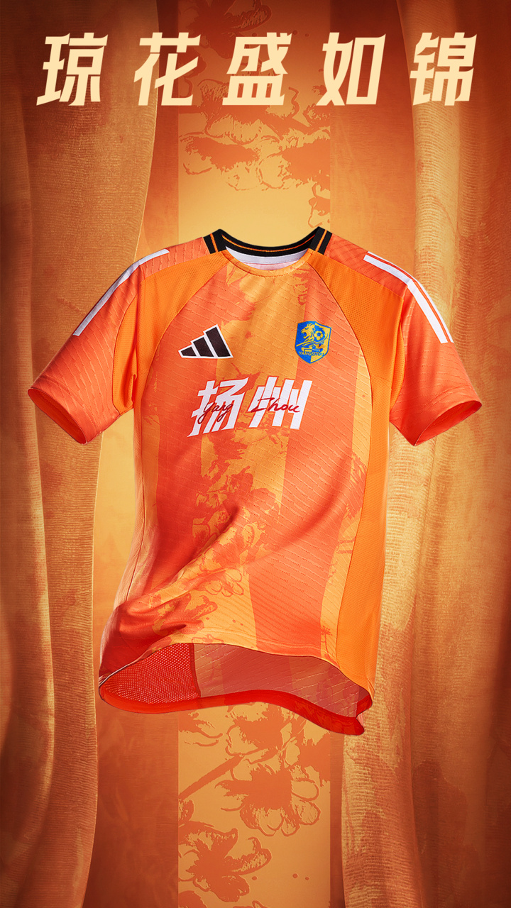 客场比赛服橙光炽烈,呼应“烟花三月”的明媚与激情。光芒般热烈的橙色配以清雅洁白的市花琼花,藏于竖条纹理之间。一烈一雅,一动一静,致敬赛场上的灵动与激情。