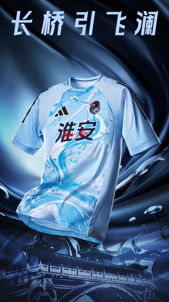 客场比赛服以常盈桥为灵感来源,以“液态化”为核心创意,赋予战袍流动的韵律感,寓意以水的柔韧应对万变,以水的深邃蓄力向前。
